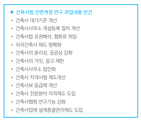 협회 관계자는 “큰 틀에서 의무가입 시행 이후 건축사 윤리와 공공성을 강화하며, 전문가로서 합당한 평가 와 공적 역할을 강화하는 차원에서 건축사업계가 처한 현실을 개선하기 위한 여러 방안들이 담기게 될 예정 이다”고 전했다.
