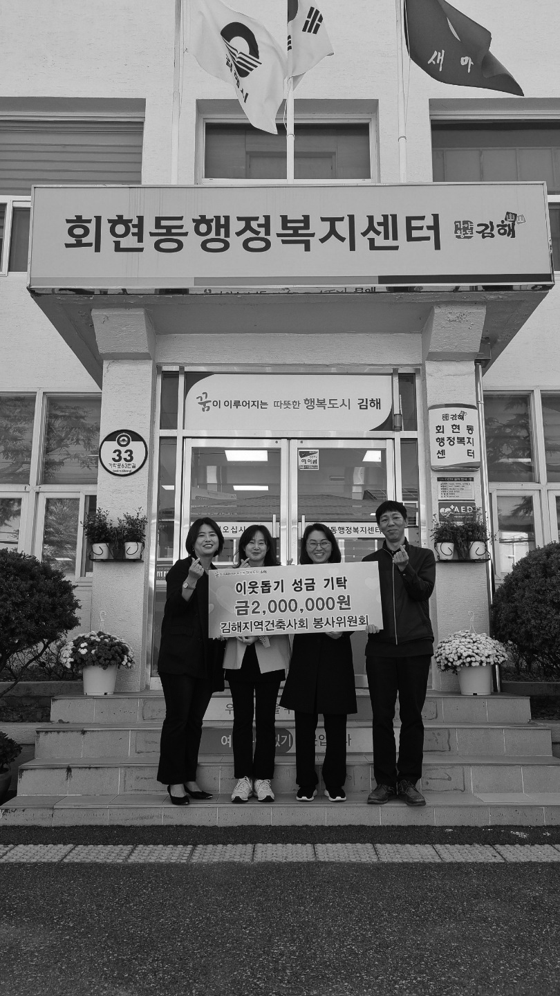 김해지역건축사회가 지난 10월 27일 김해시 회현동행정복지센터를 찾아 소외된 노인, 장애인 등 어려운 이 웃을 돕기 위해 성금 200만 원을 기탁했다. 이날 기탁된 성금은 경남 사회복지공동모금회를 통해 회현동 내 10가구에 전달될 예정이다. 또한 김해시 장유3동에는 밑반찬 지원사업을 위한 성금 180만 원을 전달했다. 해당 사업은 어려운 어르신들에게 밑반찬을 전달하며 안부를 확인하는 사업으로 만족도가 높다.