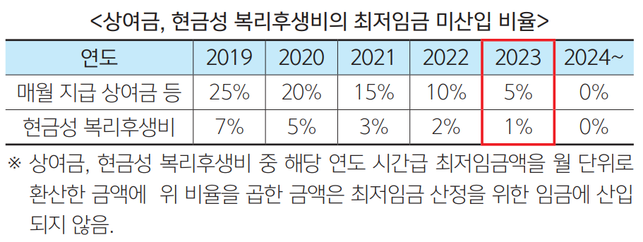 매월 지급하는 상여금 등과 현금성 복리후생비는 시간급 최저임금액을 기준으로 산정된 월 환산액의 일정 비율(미산입 비율)을 초과하는 부분만 최저임금 산정을 위한 임금에 산입된다. 최저임금법 부칙[법률 제15666호, 2018. 6. 12.] 제2조 제1항 및 제2항에 따라 미산입 비율은 단계적으로 축소되며, 2024년 이후에는 상여금 등과 현금성 복리후생비 전액이 최저임금 산정을 위한 임금에 산입된다.