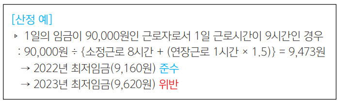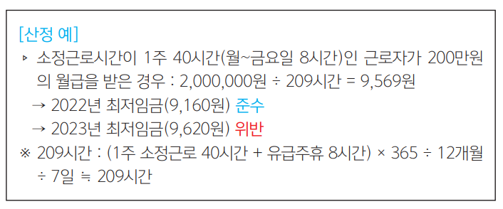 고용노동부는 8월 5일 자로 2023년 1월 1일부터 2023년 12월 31까지 적용되 는 최저임금을 시간급 9,620원(인상률 5%, 460원 인상)으로 고시하였다. 이를 월급으로 환산하면 주 소정근로 40시간 근무할 경우 2,010,580원(주당 유급주 휴 8시간 포함, 월 209시간 기준)이다.
