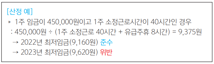 (2) 임금이 주(週)급인 경우 : 그 금액을 1주의 최저임금 적용기준 시간 수(1주 동안의 소정근로시간 수와 법정 유급주휴시간 수를 합산한 시간 수)로 나 눈 금액