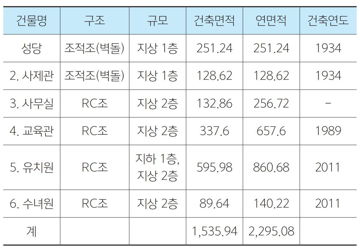 이 성당은 본당과 사제관으로 구성된다. 본당은 정면 중앙의 종탑부가 돌출한 삼 랑식의 장방형 건물로, 전면은 두 단의 석조 켜 위에, 측면은 한 단의 석조 켜 위 에 적벽돌을 쌓은 벽돌조이다. 이 석조 기단은 코니스(cornice)와 연결되어 벽 체의 프레임을 형성한다. 전면 종탑 하부의 포치는 정면만 개방되어 있고 측면 에는 벽돌로써 출입구 형태가 장식되어 있다. 벽에서 벽돌 1.5장 길이만큼 돌출 된 버트레스(buttress), 그리고 처마장식과 창 둘레에는 짙은 회색 벽돌을 사용 하였다. 전면 아일(aisle)부분 외벽의 코니스를 따라 있는 작은 연속 원형아치 장 식과 종탑부 버트레스 꼭대기 피나클의 장식이 특이하다. 원형아치의 창들은 형 태뿐 아니라 세부처리에 있어서도 모두 동일하다. 지붕재료는 함석에서 동판으 로 교체됐으며, 측면에 환기창이 있다. 내부는 네이브와 아일 구별이 뚜렷한 6개 의 회중석 베이(bay)와 1개의 제단 베이 및 오각으로 꺾인 앱스(apse)와 제단 좌우의 제의실로 구성된다. 네이브와 아일 사이에는 목제 주초 위에 벽돌 문양을 칠한 목제 기둥이 줄지어 있다. 네이브와 아일의 상부는 모두 목제 리브(rib)을 가진 배럴 볼트(barrel vault) 천장인데 그 높이 차이가 작아서 실내가 하나의 개방적인 공간으로 느껴진다. 바닥은 마루로 되어 있고, 내부 벽은 프라스터 마감 이며 창 주위에는 외부의 세부처리가 반복되었다.