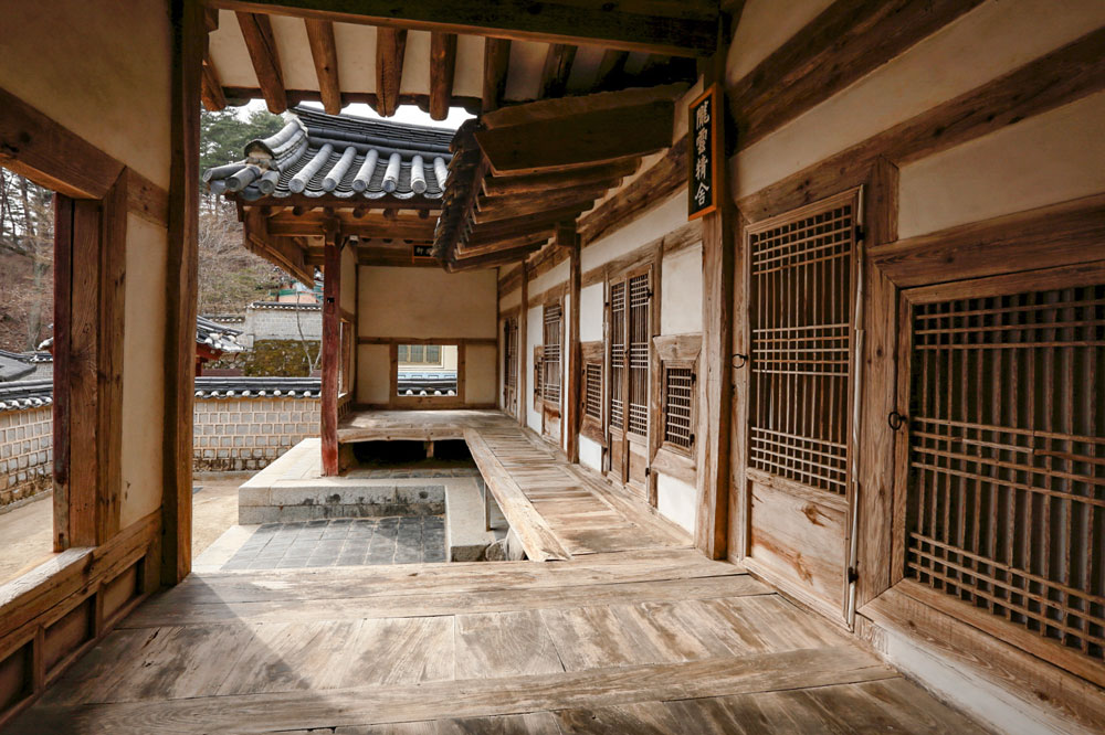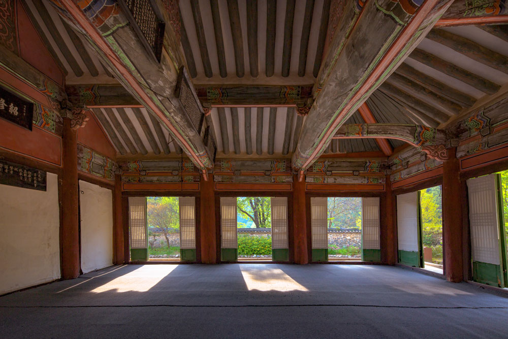 신재 주세붕이 조선에 성리학을 도입한 회헌 안향의 학덕을 기리기 위해 세운 한 국 최초의 서원인 소수서원紹修書院의 명륜당明倫堂은 다른 서원의 강당과 그 모습이 다르다. 3×3칸의 정사각형 대청마루가 북측의 온돌방을 제외한 동쪽, 서 쪽, 남쪽 방향으로 한지 창문을 두르고 있다. 정사각형 강당 마루에 한지 문짝을 두른 곳은 소수서원이 유일하다. 동쪽의 창문으로 햇살이 내려앉으면 문살에 강 한 음양이 새겨지고 흐릿한 창문이 조금씩 빛으로 물들어 실내 공간이 밝아진다. 명륜당의 대청마루는 하루의 시간을 알려주는 해시계와도 같다.