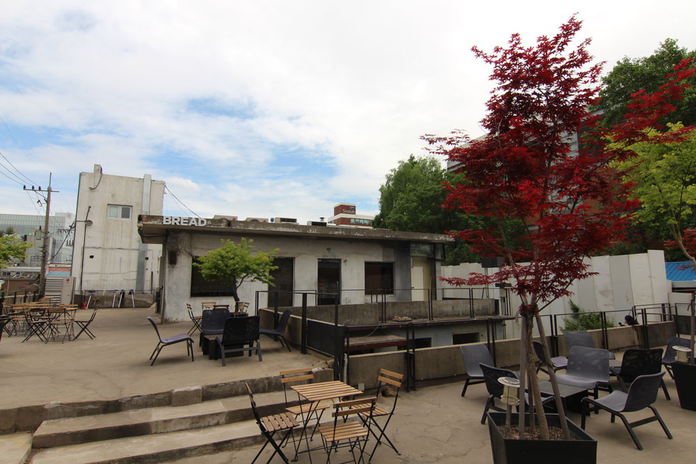 어니언은 두 채의 건물로 이루어져 있다. 1층은 마당을 사이에 끼고 있어 내부가 연결되어 있지 않지만, 옥상을 뚫고 우뚝 솟아있는 베이커리 건물 앞 브릿지를 통 해 연결된다. 더불어 베이커리에서 뿜어져 나오는 고소한 빵 굽는 냄새는 옥상을 가득 채우다 못해 흘러넘친다. 냄새에 이끌려 올라간 옥상 라운지는 시끄럽지만 차분했다. 차들이 움직이는 소리가 빌딩 숲 사이로 메아리 친다. 그러나 옥상은 아랑곳하지 않고 온전히 자신만의 분위기를 내뿜고 있었다.