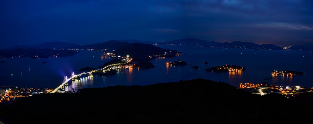 남해대교, 창선대교, 삼천포 대교에 조명이 켜지기 시작 하는데, 그 다리 위로 자동차들이 질주하면서 어두워진 남해바다에 생명을 불어넣는다. 아름다운 우리의 남·해·바·다 한·려·수·도..