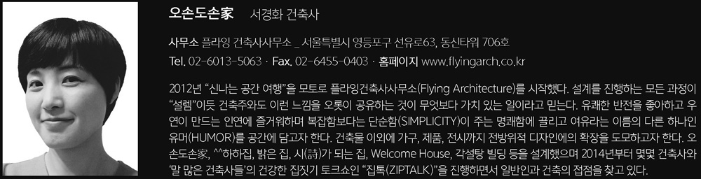 | 오손도손家 설계자 _ Architect. 서경화 _ Seo, Kyounghwa 플라잉 건축사사무소 _ Flying Architecture 건축주 | 서창길 감리자 | 서경화 _ 플라잉 건축사사무소 시공사 | 케이에스하우징 설계팀 | 조종화 대지위치 | 충청남도 금산군 남일면 금산로 214-14 주요용도 | 단독주택 대지면적 | 705.40㎡ 건축면적 | 153.81㎡ 연면적 | 146.39㎡ 건폐율 | 21.80% 용적률 | 20.75% 규모 | 지상 2층 구조 | 경골목구조 외부마감재 | 회색치장벽돌(유성벽돌 : HK전돌), 스터코플렉스 내부마감재 | 벽지 설계기간 | 2018. 01 ~ 2018. 06 공사기간 | 2018. 06 ~ 2018. 10 사진 | 유근종 구조분야 : (주)두항구조안전기술사사무소 기계설비분야 : (주)코담기술단 전기분야 : 시엔에스엔지니어링 |