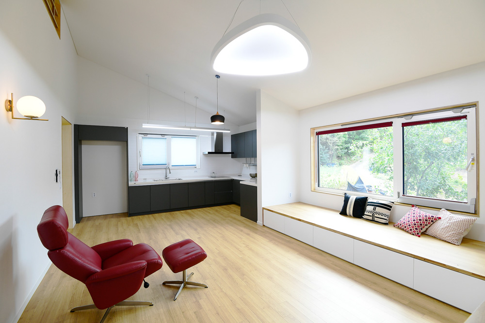 주택은 전형적인 전원 한 가운데 위 치한다. 전원의 산을 배경으로 산세 를 닮은 경사지붕이 연상됐고 이것 이 곧 디자인의 출발이 됐다. 레벨차 가 더해지니 중첩된 경사지붕은 흡 사 시골 산의 축소판을 보는 듯하다. 형태는 본래 한 매스에서 출발했다. 마치 부모와 자식처럼. 부모님존과 자녀존은 길게 반으로 나누고 엇갈 리게 배치하여 서로 방해받지 않고 독립적인 생활이 가능하도록 했다.