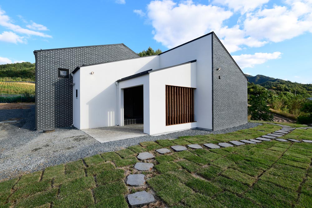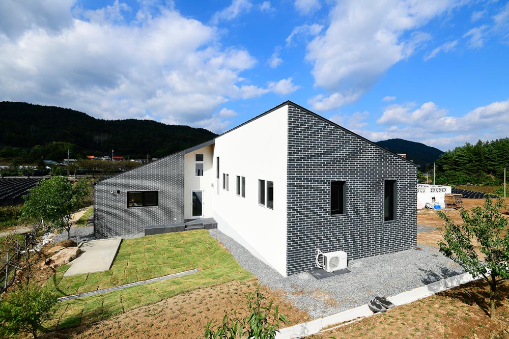 주택은 전형적인 전원 한 가운데 위 치한다. 전원의 산을 배경으로 산세 를 닮은 경사지붕이 연상됐고 이것 이 곧 디자인의 출발이 됐다. 레벨차 가 더해지니 중첩된 경사지붕은 흡 사 시골 산의 축소판을 보는 듯하다. 형태는 본래 한 매스에서 출발했다. 마치 부모와 자식처럼. 부모님존과 자녀존은 길게 반으로 나누고 엇갈 리게 배치하여 서로 방해받지 않고 독립적인 생활이 가능하도록 했다.