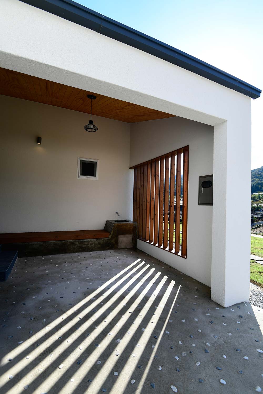 The outer space surrounding the house, is designed as two areas, an open yard for entrance and a private yard. Exterior closing is also made to conform to the meaning of the space. Like a cross section of a fruit, the outer part of a mass is covered by solidfeeling gray bricks, while the inner part is plastered with white stucoflex.