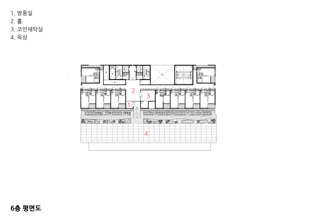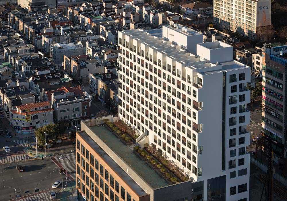 고층부 주거공간의 공용마당은 상업지역에서 가질 수 없는 남향의 넓은 마당 으로, 계절에 따라 다양한 역할을 담당한다. 아이들이 뛰어놀고 사람들이 산책 하는 소리를 들을 수 있으며 관찰할 수 있다. 도시에서 임시방편으로 머물 수 있는 ‘도구화된 주거 공간’이 아니라, 낭만적이고 감성적인 느낌을 내부에까지 전달되도록 했다.