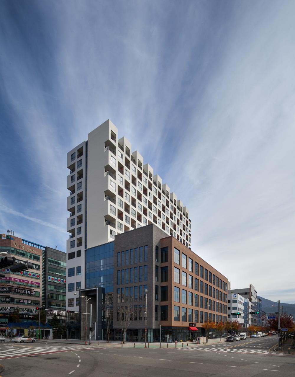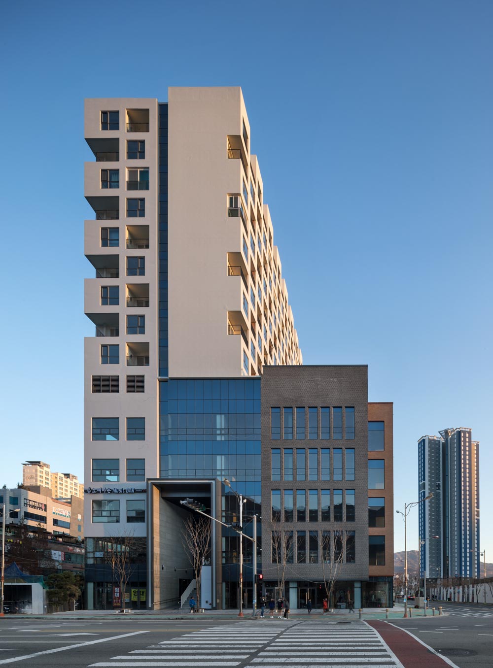The On Place Yangsan is located in the center of the commercial area of Yangsan New Town in Mulgeum, Yangsansi, Gyeongsangnam-do. It is a place where there are so many signboards as if to compete with each other in the commercial center of a large city. As is the case with many buildings that have been greatly influenced by capitalism, almost all spaces are filled to function. Thoroughly filled spaces do not have the spatial consideration to meet each other. However, The On Place Yangsan is making a new proposal to find another value by emptying, getting out of this stereotype.