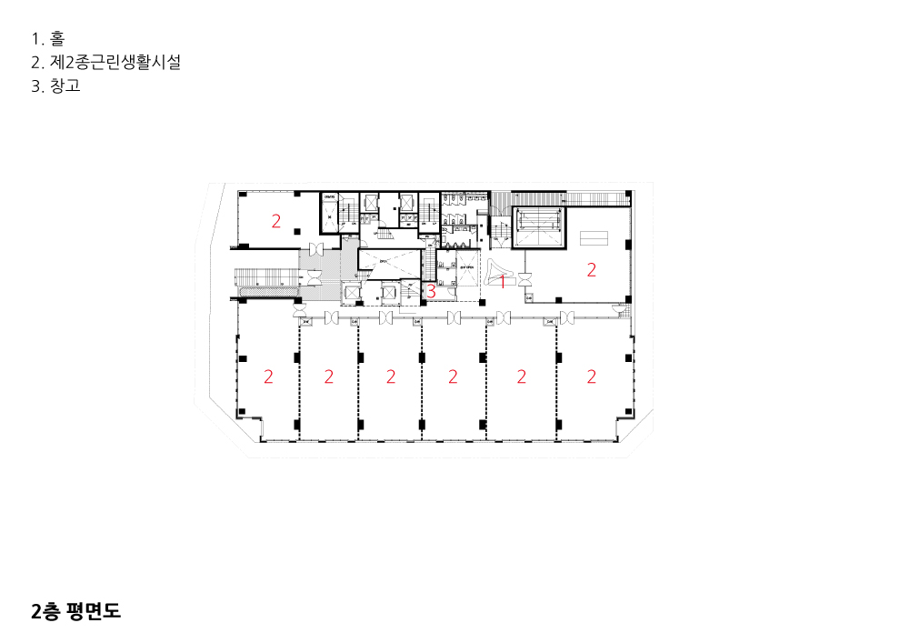 There are two main factors that we proposed in this project. One is a large vertical indoor courtyard of low-floor commercial facilities, and the other is a public large-sized yard of high-rise residential areas. The low-rise shops do not only fill the space with commercial facilities, but rather empty it, creating a public space that can not be found in commercial buildings in cities. The natural light coming into the ceiling of the indoor courtyard flows over time, and people can feel that naturally flowing space is maximized when they walk along the vertical decks connected from the first floor to the third floor. The visually and directly connected flow of space leads up to the upper part of the movement line staying in lower floors and thenbecomes a better space as a commercial facility.