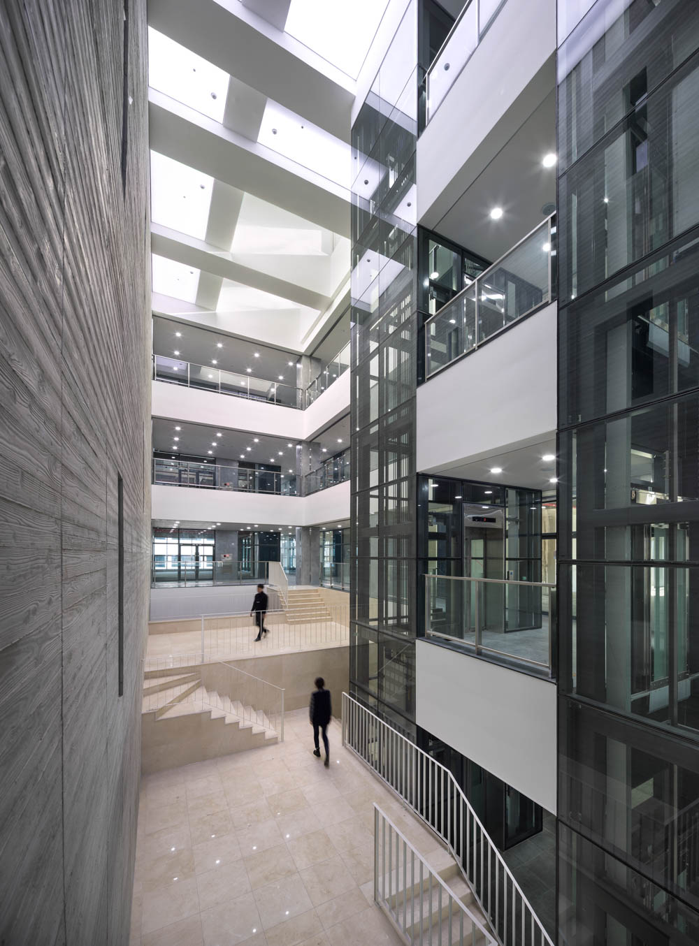 또한 외장재로 콘크리트가 아닌 흑색벽돌과 황토색 벽돌을 사용하여 공간을 질감으로도 느낄 수 있으며 노출엘리베이터가 아래층 위층을 오르내리며 내외 부에서 발생하는 공간감도 만끽한다.