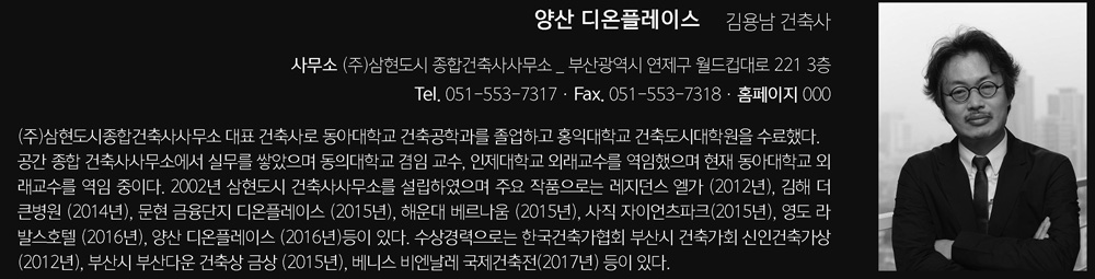 | 양산 디온플레이스 설계자 _ Architect. 김용남 _ Kim, Yongnam (주)삼현도시 종합건축사사무소 _ Samhyun Urban & Architecture Group 건축주 | (주)디온개발 감리자 | 김용남 _ (주)삼현도시 종합건축사사무소 시공사 | 덕양건설 설계팀 | 허재녕, 배현송 대지위치 | 경상남도 양산시 물금읍 삽량로 30 주요용도 | 업무시설(오피스텔), 근린생활시설 대지면적 | 2,116.00㎡ 건축면적 | 1,673.45㎡ 연면적 | 16,784.07㎡ 건폐율 | 79.09%(법정 80%) 용적률 | 605.20%(법정 1000%) 규모 | 지하 3층, 지상 14층 구조 | 철근콘크리트조 외부마감재 | 벽돌(검은색, 연갈색), T24 로이 복층유리 내부마감재 | 폴리싱타일 설계기간 | 2014. 11 ~ 2015. 03 공사기간 | 2015. 06 ~ 2016. 11 사진 | 윤준환 구조분야 : (주)인비전코리아 - 기계설비분야 : 나인설비설계사무소 - 전기분야 : (주)광명토탈엔지니어링 - 소방분야 : 나인설비설계사무소, (주)광명토탈엔지니어링 |