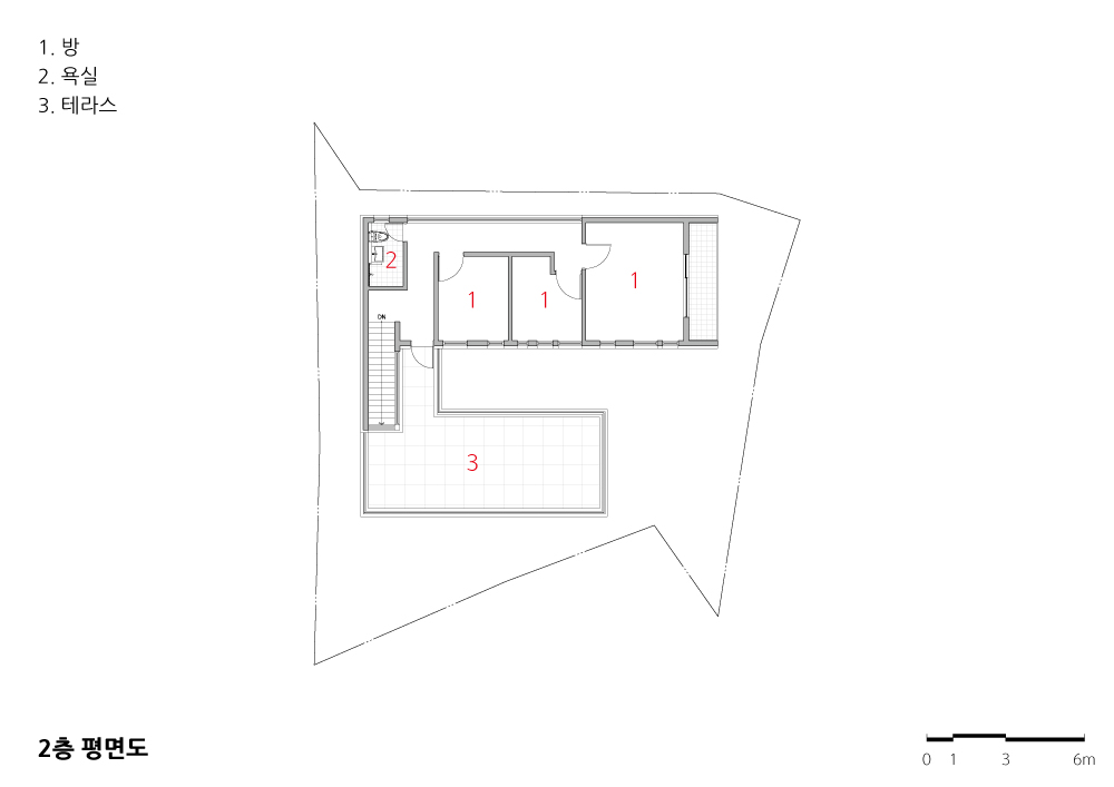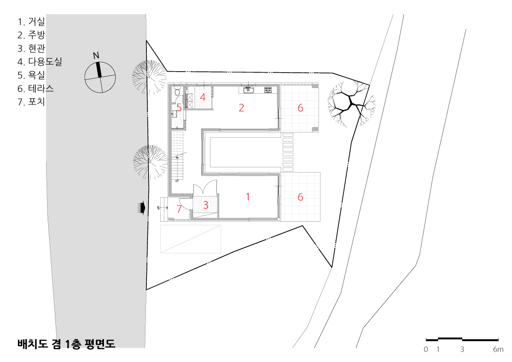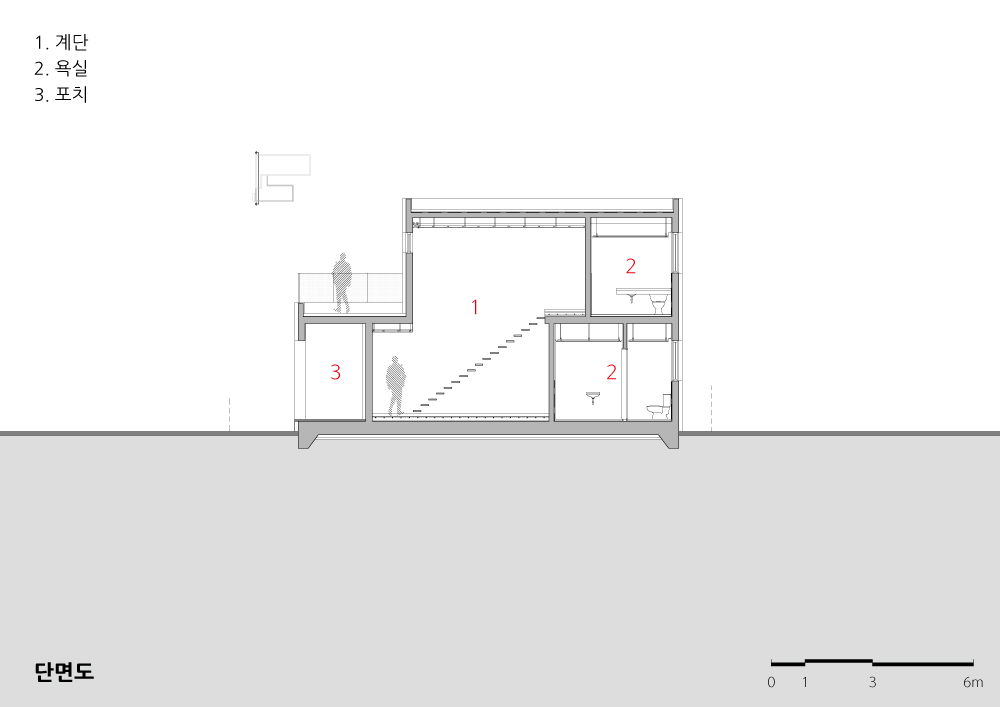 본 주택은 우리가 공식처럼 사용하는 LDK를 겸하는 형태가 아닌 거실과 주방 겸 식당을 분리하고 있다. 협소주택의 단점을 극복하기 위한 방안으로 과감하 게 공간을 구분한 대신 유리창을 통해 시각적으로 오픈, 중정을 통해 관통하는 공간의 연속성을 나타내었다. 이처럼 하나인 듯 두 개의 공간인 거실과 주방간 의 시선의 소통으로 확장된 공간형태로 나타난다.