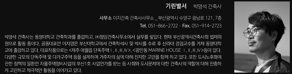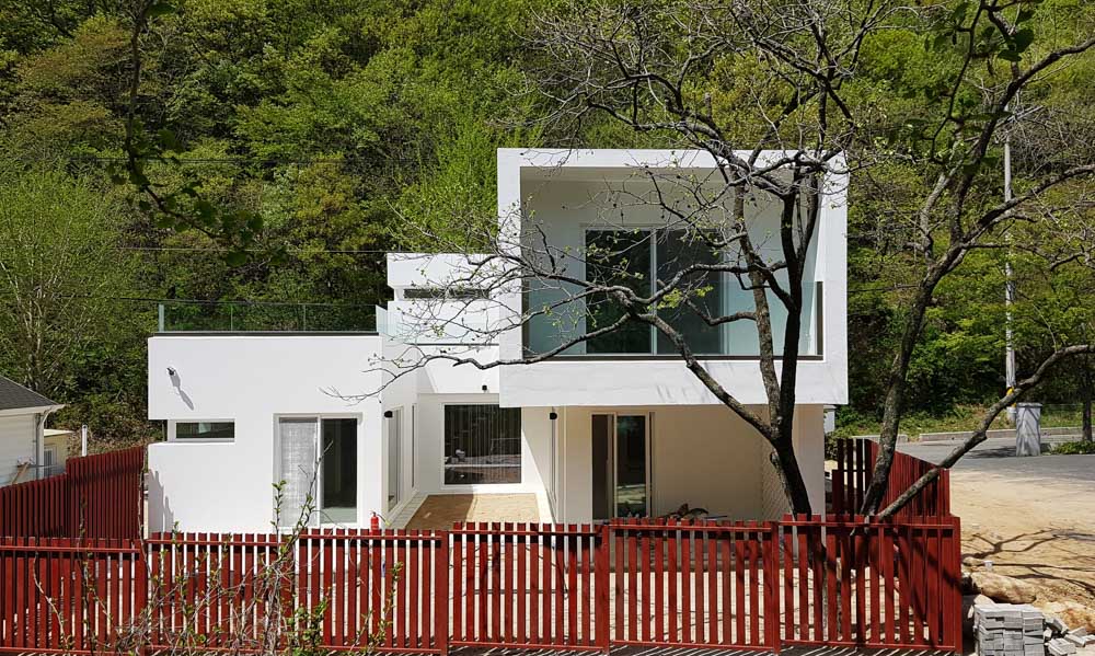 Kirin Byeolseo is a small house with the motif of "Dansaekhwa(Monochrome)" located in Byeongsan-ri, Gijang-gun. Monochrome is a painting of Korean tradition and aesthetics using only one color. Only white were used to tear, fill, and overlay the paintwork on top of the paint and to minimize the externally protruding facade elements to maximize the simple formative beauty of the building.