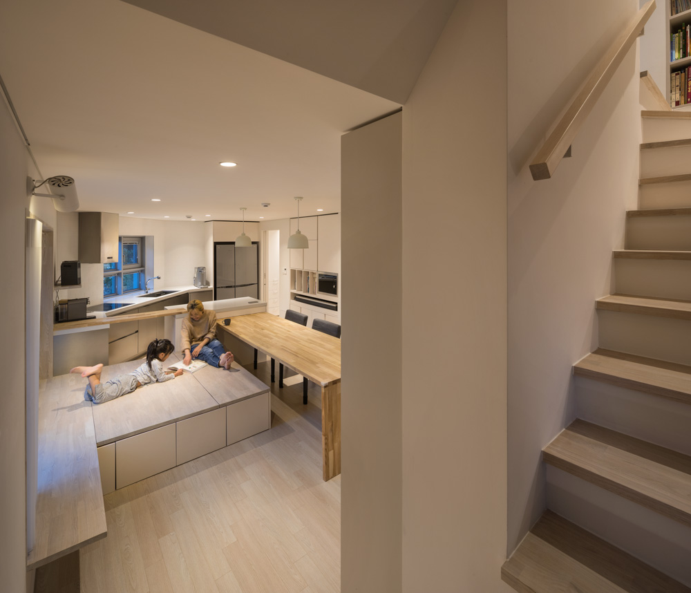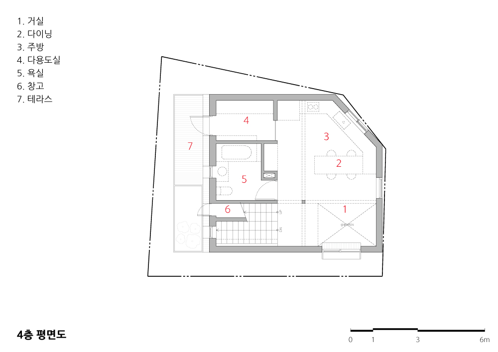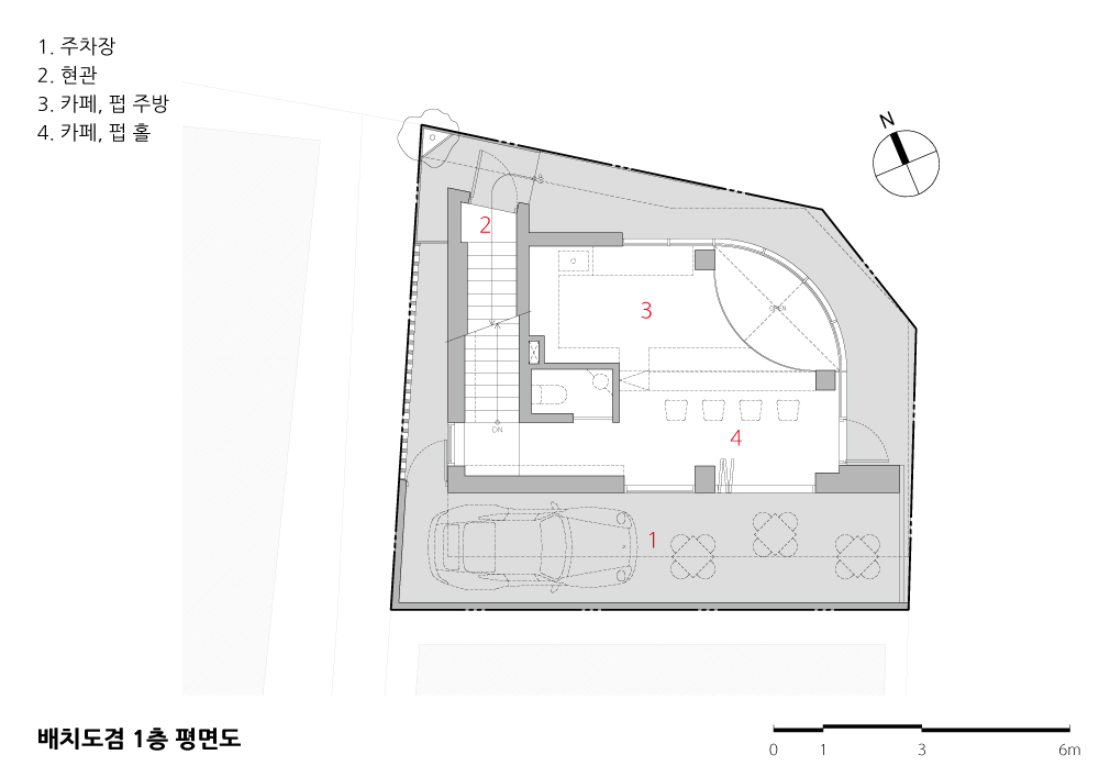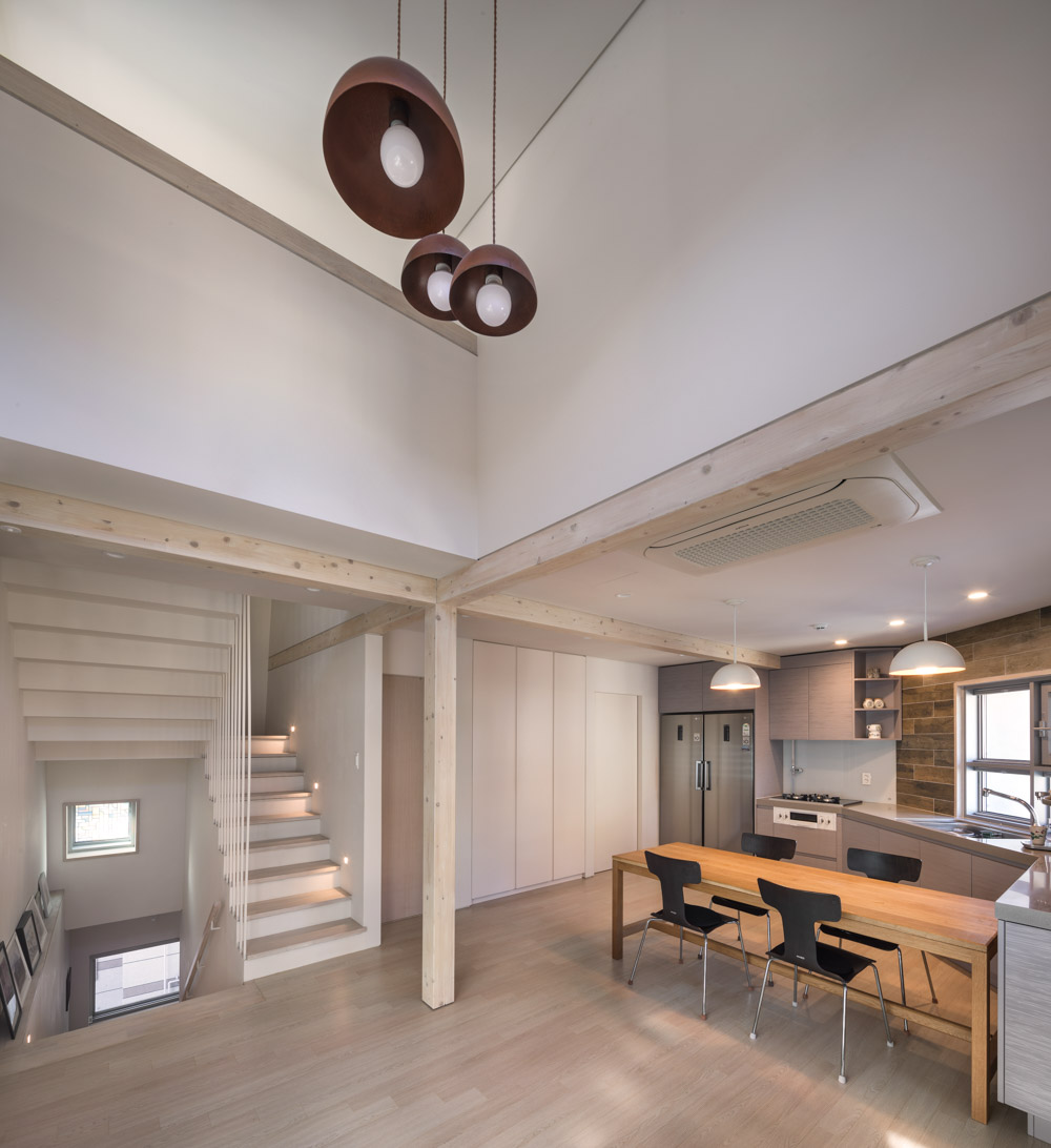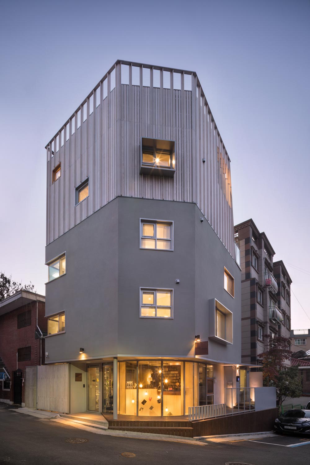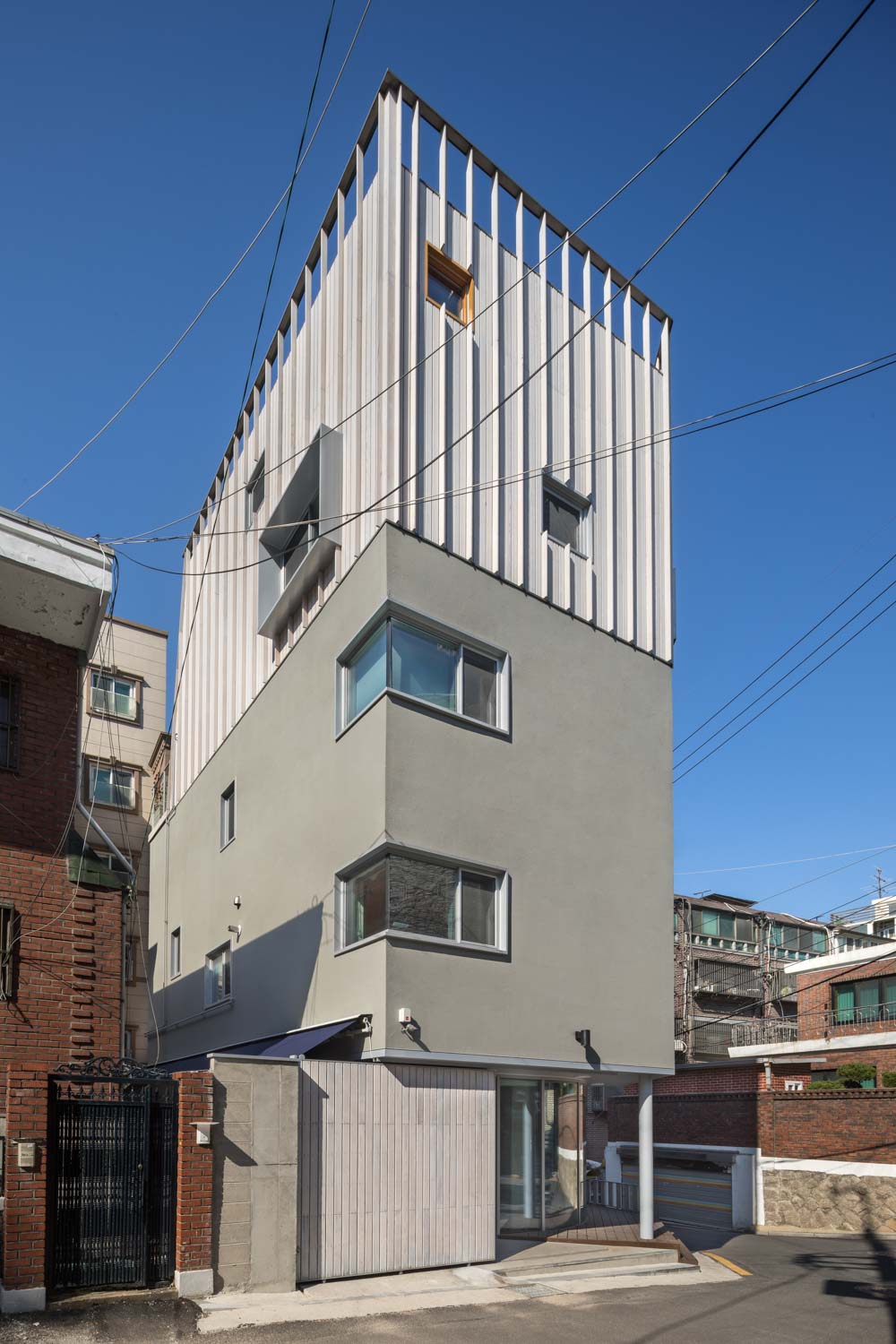 Through the process of modernization and urbanization, the meaning of a house has been dismantled and divided. People are born and die in hospitals, not homes. We live in homogeneous housing products, not in neighborhoods. We work in offices and rest in travel destinations. As one philosopher said, residence hit the road. The client, who used to be satisfied with the life in an apartment, decided to build a house to provide space for three generations to live together and a cafe/pub that the family will run together. It is the house where the three generations reside separately yet together and run the family business, which is to restore the meaning of residence' in the days when the pre-modern housing and production takes place together.