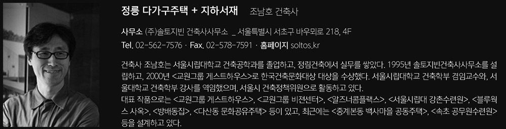 | 정릉 다가구주택 + 지하서재 설계자 |조남호 _(주)솔토지빈 건축사사무소 건축주 | 송무, 손현숙, 송율 감리자 | 조남호 _ (주)솔토지빈 건축사사무소 시공사 | 지음재건설 설계팀 | 조예린 대지위치 | 서울특별시 성북구 보국문로18길 34 주요용도 | 제2종 근린생활시설, 다가구주택 대지면적 | 94.00㎡ 건축면적 | 56.35㎡ 연면적 | 190.74㎡ 건폐율 | 59.92% 용적률 | 167.93% 규모 | 지하 1층, 지상 4층 구조 | 철근콘크리트조 + 목구조 외부마감재 | 외벽 – 스터코, 무절적삼목 사이딩 / 지붕 – 컬러강판 내부마감재 | 내벽 – 삼화 친환경 페인트(뉴월드 2종 2급) / 바닥 - LG 스칸디나비안 그레이 강마루 설계기간 | 2017. 01 ~ 2017. 08 공사기간 | 2017. 09 ~ 2018. 04 사진 | 윤준환 구조분야 : 모산이엔씨(주) 기계설비분야 : (주)코담기술단 전기분야 : (주)코담기술단 소방분야 : (주)코담기술 |