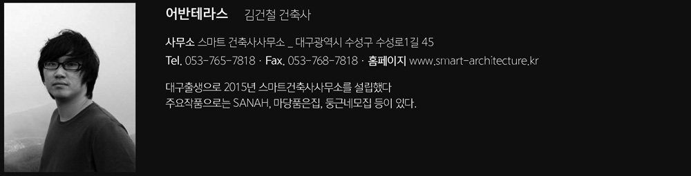 | 어반테라스 설계자 | 김건철_스마트 건축사사무소 건축주 | 김점남 감리자 | 김건철 _ 스마트 건축사사무소 시공사 | 김점남 설계팀 | 이승은, 김종규, 배춘근 대지위치 | 대구광역시 수성구 동대구로17안길 13 주요용도 | 다가구주택 대지면적 | 331.20㎡ 건축면적 | 251.22㎡ 연면적 | 484.06㎡ 건폐율 | 75.85% 용적률 | 146.15% 규모 | 지상 3층 구조 | 철근콘크리트조 외부마감재 | 외단열공법피니쉬마감, 아연도강판 내부마감재 | 강마루, 수성페인트, 벽지 설계기간 | 2017. 01 ~ 217. 06 공사기간 | 2017. 06 ~ 2018. 03 사진 | 윤동규 전문기술협력 구조분야 : 보루구조 기계설비분야 : 한국기연 전기분야 : 우진전기 |
