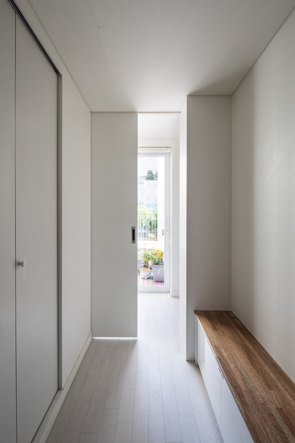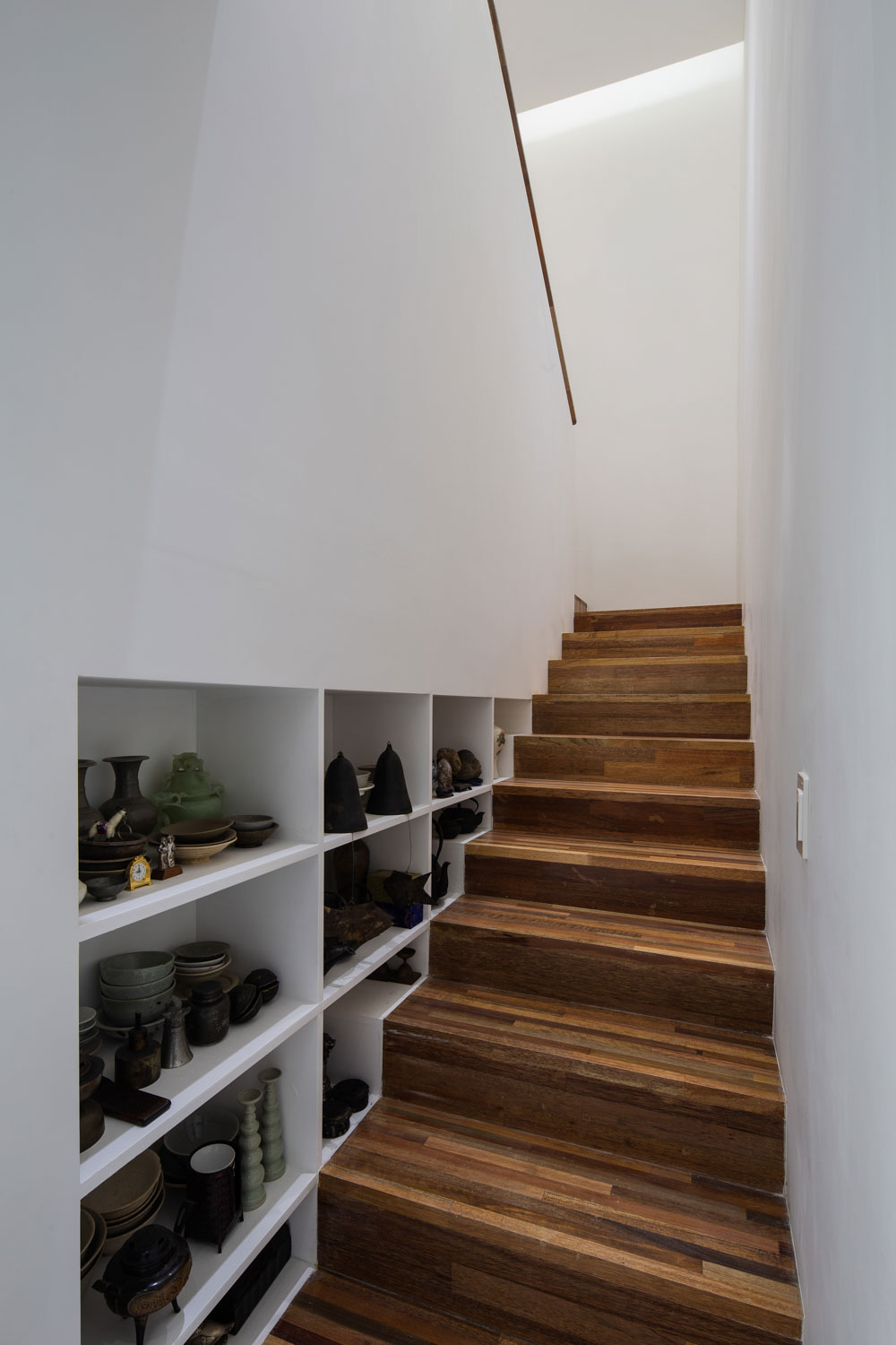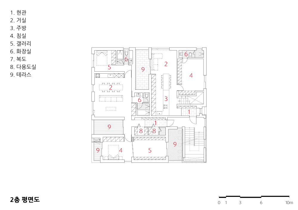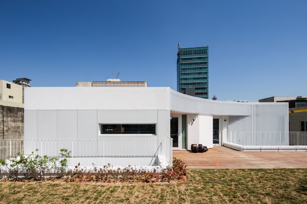 Intermediate outdoor space is placed adjacent to indoor space, and courtyards, decks, and terraces are included to serve as a space for interconnecting the interior and the exterior. This outdoor space can protect the privacy of residential space according to the planning method, and it can acquire solar radiation suitable for seasons through the securing of eaves. In addition, wider indoor space that expands to outdoor space creates the spacious interior. The first floor is planned to be a neighborhood living facility for rent, and the second and third floors are planned to include two houses: one duplex house where the client’s couple and their two children will reside, and the other where the client's parents will live. Based on the client’s requirements, terraces were placed in different places to make space uninterrupted and open. The external appearance is the result of the way of putting terraces between the client's requirements. The client preferred to make both interior and exterior white finished. White was used but stuco, galvanized steel sheet and aluminum louver were properly used considering the physical properties of materials and the location of finishing materials