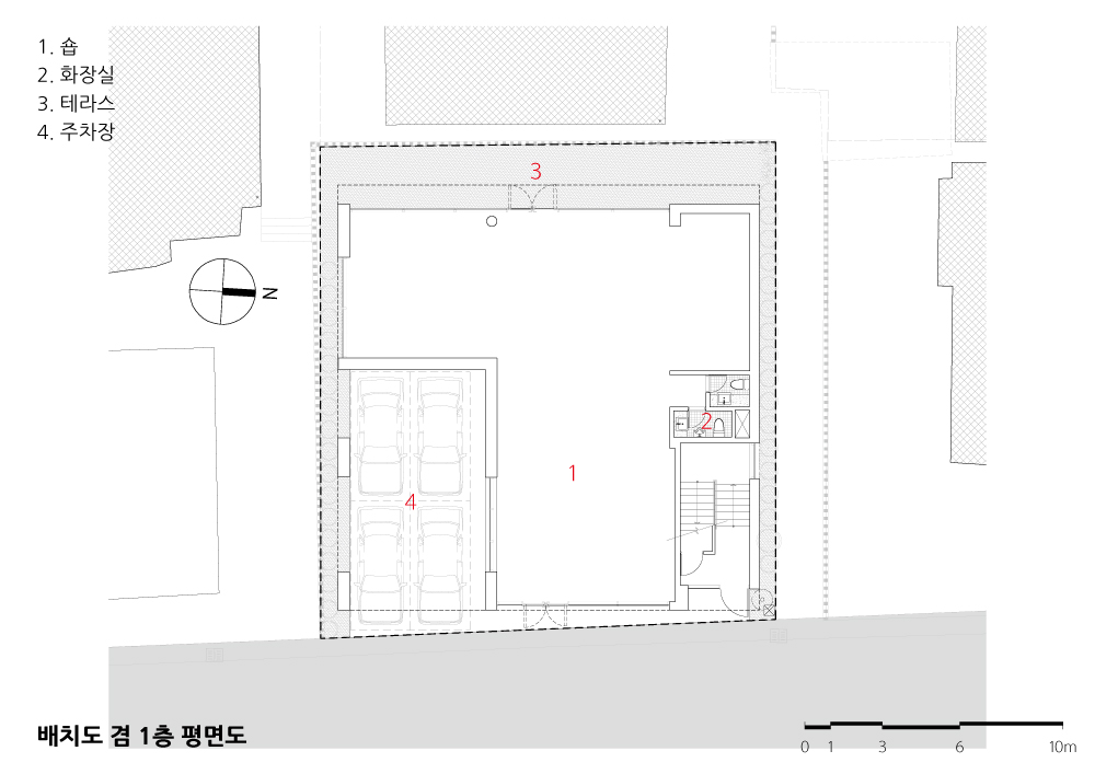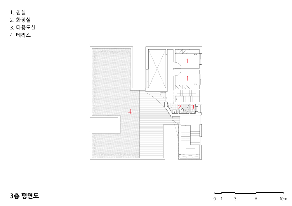중간적 외부공간은 실내공간에 인접 배치되 어, 내·외부를 이어주는 역할을 하는 공간으 로서 중정, 데크, 그리고 테라스 등이 포함된 다. 이러한 외부공간은 계획방식에 따라 주거 공간의 프라이버시를 보호할 수 있으며, 처마 확보를 통한 계절에 맞는 일사량을 획득 할 수 있게 한다. 또한 외부로 확장된 내부의 공 간감으로 더욱 넓은 실내의 공간감을 만들어 낸다. 1층은 임대목적의 근린생활시설로 계 획되었으며, 2층과 3층은 건축주 내외와 2 명의 자녀가 거주하게 될 복층형 주택 1가구 와 건축주 부모님 내외가 거주하게 되는 1가 구를 합해 2가구로 계획됐다. 요구조건을 수 렴함과 동시에 테라스를 군데군데 배치하여, 답답하지 않고 열려있는 공간이 되도록 계획 했다.