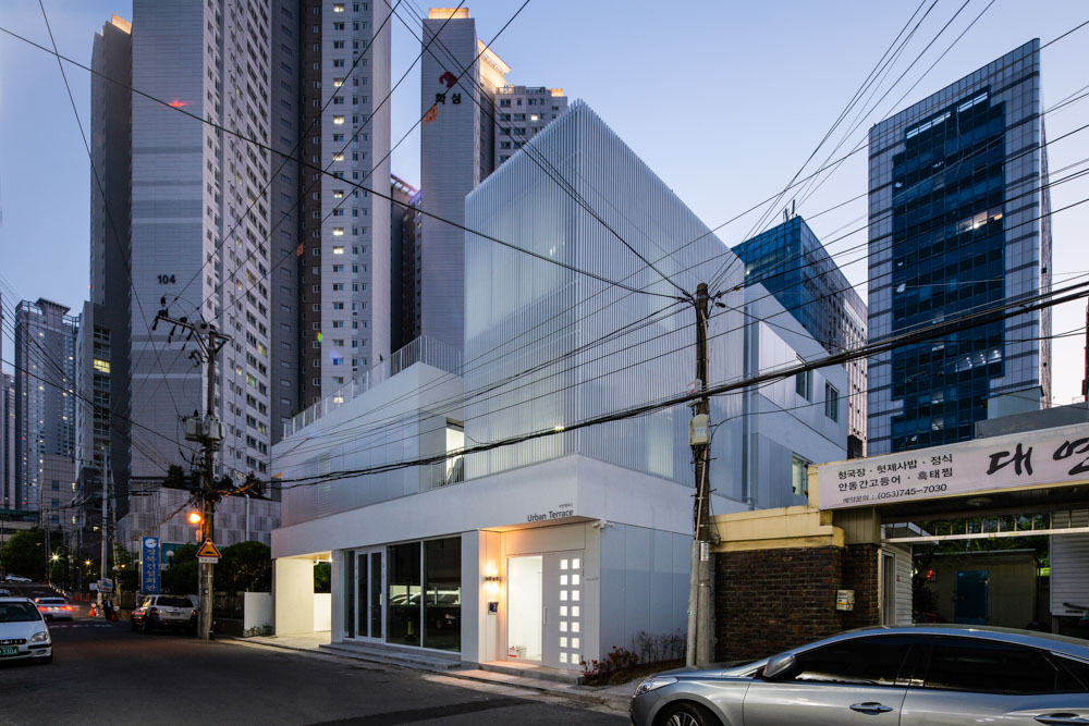 어반테라스는 대구광역시 수성구 범어동에 위 치한 여러 개의 테라스를 가진 상가주택이다. 대지는 대구의 중요한 대로 중 하나인 동대구 로의 이면도로에 위치한다. 주변상황은 기존 에 있던 낡은 단독주택과 연립주택이 주상복 합건축물과 오피스로 바뀌어가고 있는 과도 기적 상황에 있다. 우리는 과밀의 대도시에서 살아가는 이들을 위한 대안적 건축물이 되길 바라며 어반테라스를 설계했다. 중간적 성격 을 갖는 외부공간의 가능성을 그 대안으로 검 토하며 디자인했다.