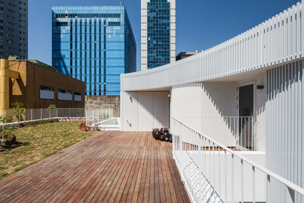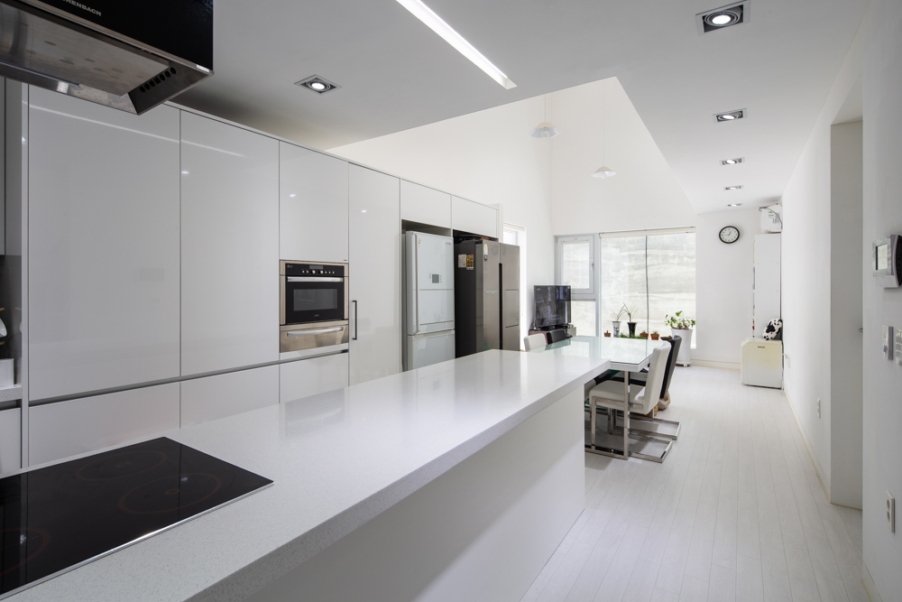 Intermediate outdoor space is placed adjacent to indoor space, and courtyards, decks, and terraces are included to serve as a space for interconnecting the interior and the exterior. This outdoor space can protect the privacy of residential space according to the planning method, and it can acquire solar radiation suitable for seasons through the securing of eaves. In addition, wider indoor space that expands to outdoor space creates the spacious interior. The first floor is planned to be a neighborhood living facility for rent, and the second and third floors are planned to include two houses: one duplex house where the client’s couple and their two children will reside, and the other where the client's parents will live. Based on the client’s requirements, terraces were placed in different places to make space uninterrupted and open. The external appearance is the result of the way of putting terraces between the client's requirements. The client preferred to make both interior and exterior white finished. White was used but stuco, galvanized steel sheet and aluminum louver were properly used considering the physical properties of materials and the location of finishing materials