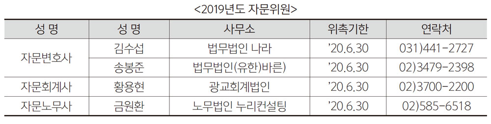 자문 노무사에는 금원환 노무사가 위촉됐다. 금원환 노무사는 노무법인 누리컨설팅의 대표로서, 한국공인 노무사회 이사를 역임하고 대한전문건설협회 서울시회 노무자문위원, 서초구의회 노무분야 자문위원 등을 담당하기도 했다. 또 고용노동부 및 노동위원회, 근로복지공단 등 노무관련 사건 대리인으로 활동했다. 이들은 2020년 6월 30일까지 대한건축사협회 자문위원으로 활동하게 된다. 대한건축사협회 자문위원의 임기는 1년이다.