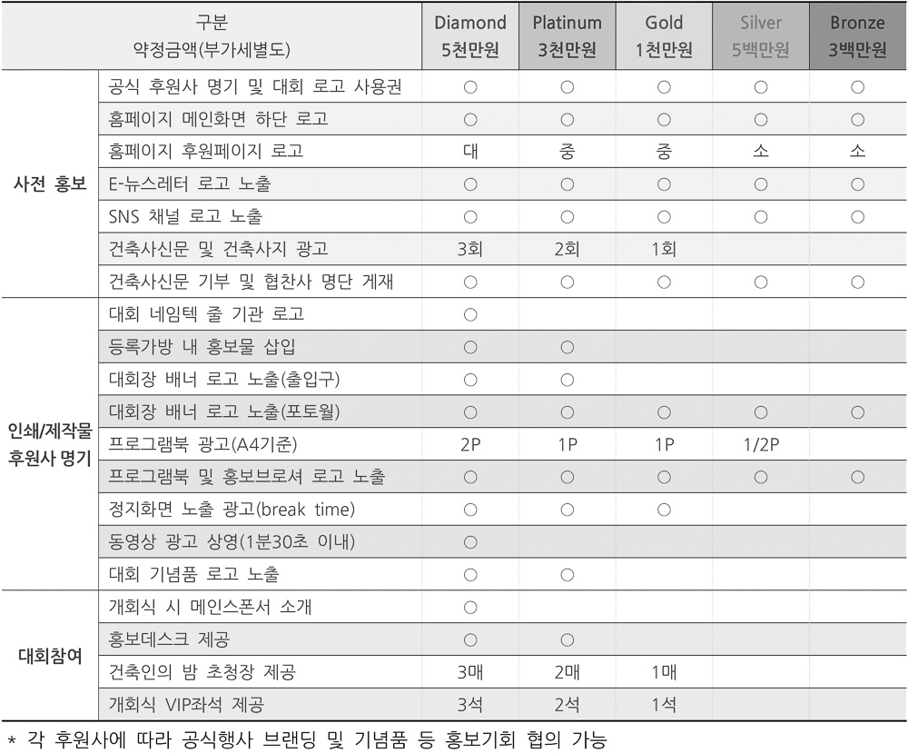 먼저 1만여 건축사 회원 및 관계기관에 배포되는 각종 대회 홍보물과 홈페이지 및 SNS, E-뉴스레터 등 다양한 곳에 후원 기업이 노출되고, 대회 후원사로서 각종 기업 홍보물에도 대회로고를 사용할 수 있다. 건축과 관계된 다양한 인사들이 참여하는 대회에 후원사로 참여함으로써, 건축계에 기여하는 기업 이미지를 구축할 수 있다.