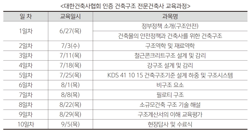 교육과정은 10주에 걸쳐 39시간으로 구성됐고, 실무중심의 강사진에 교육내용도 최상급으로 조정했다. 권연하 건축사교육원장은 “교육에 참여한 회원 모두가 현업 20년 이상의 전문가이기 때문에 실무 중심 커 리큘럼과 강사진으로 편성했다”며 “앞으로 회원분들이 교육과정 이수 후 건축구조 전문건축사로서 활동하 면서 지역 교육과정 강사로도 역할을 해주길 바란다”고 전했다.
