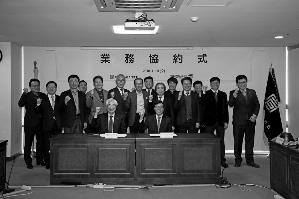 대한건축사협회(이하 사협)와 교육시설재난공제회(이하 교육시설공제회)가 1월 10일 건축사회관 8층 중회의실에서 안전한 교육시설 및 건축물을 위한 업무협약을 맺었다.