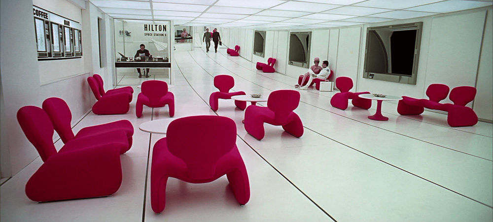 프리츠 랑(Fritz Lang)이 기계시대에서 미래를 그려내었다면, 스탠리 큐브릭은 전자 시대를 넘어서 인공지능(AI)의 미래를 만들어내었다. 지금의 시선으로 본다면 아날로그적인 화면 속 장치들이지만, 당시에는 이러한 장치들을 첨단의 전자장치로 생각했던 것 같다. 화면 가득 채우고 있는 공간의 디자인들은 기계적이고, 섬세한 디테일이 풍부한 구성을 보여주기 보다는 감추어진, 간결함을 중심으 로 디자인되었다. 이러한 단순성은 20세기의 시작부터 시작된 모더니즘의 영향이었을 것이라는 생각이 든다. 장식이 다시 힘을 얻으면서 등장했던 시기, 즉 포 스트 모더니즘의 건축과 인테리어는 직설적인 과거의 장식을 인용할 뿐만 아니라, 기계의 고전적 장식적 형태를 드러내었다. 이 점에서 마치 라디에이터나 터빈 같은 기계적 구성을 마치 반복적이고 화려한 디테일의 장식으로 치환했던, <배 트맨>, <블레이드 런너>와는 아주 대조적인 시각적 구성이었다. <2001 스페이 스 오디세이>는 다양한 디자인을 보여준다. 영화 중심으로 나오는 우주선의 공간을 살펴보면, 60년대를 풍미했던 사이키델릭한 기하학의 구성을 볼 수 있게 된 다. 이러한 디자인은 피에르 가르뎅이나 파코라반 등의 <스페이스 룩>이라 지칭 한 유니크하고 기하학적인 이미지의 패션도 볼 수 있다. <2001 스페이스 오디세이>에서도 나오는 올리비에 모그의 붉은색 소파들 같은 유기적이고, 기하학적 형태들은 모티브로 디자인되었다. 덴마크 출신으로 60년대 플라스틱 가구 등을 발표한 베르너 판톤(Verner Panton)의 다양한 디자인들을 보면, 60년대의 모험을 알 수가 있다.
