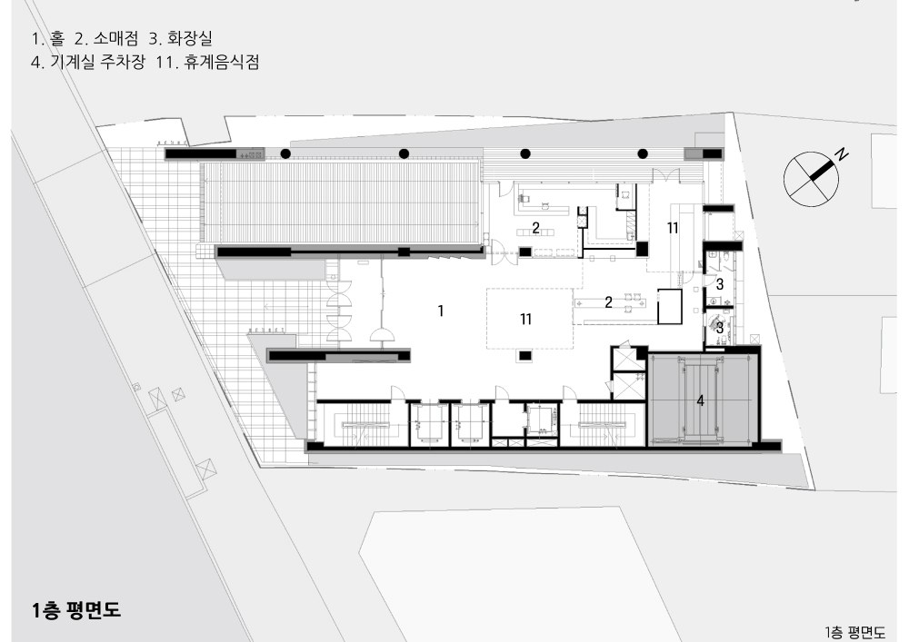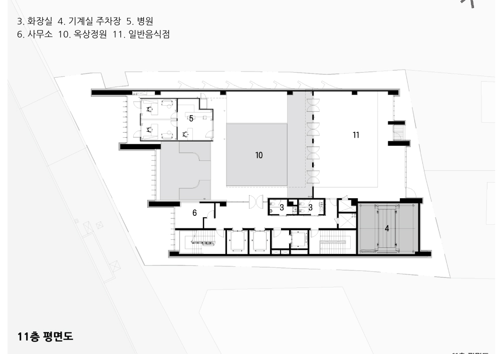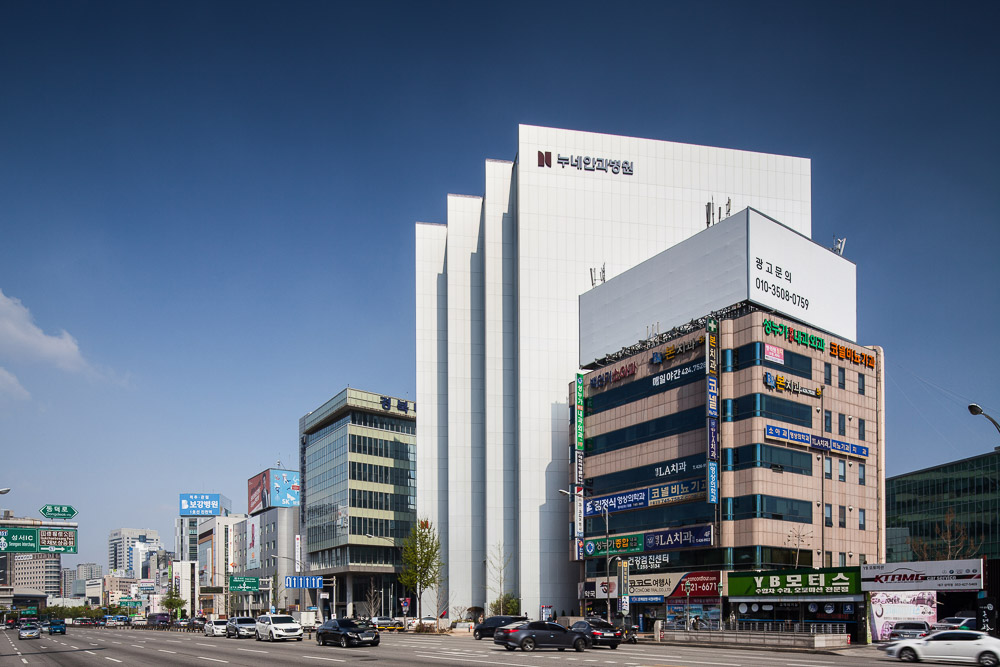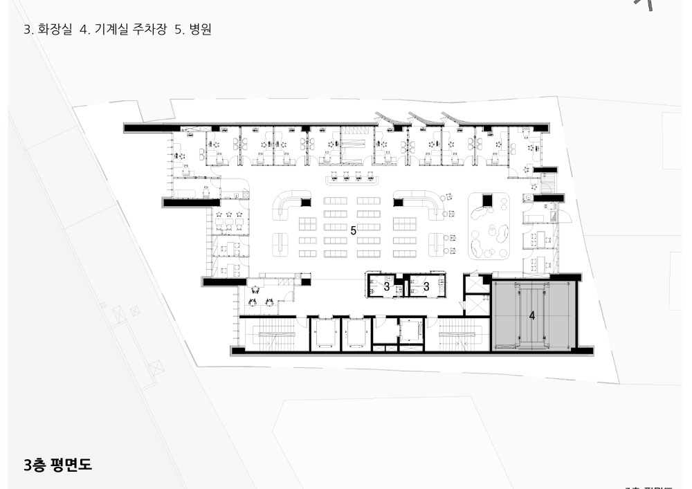 Most buildings located on the main roads passing through the urban center are basically to compete with each other for height to the sky, shoulderto shoulder. Daegu's main artery, Dalgubul Street, is also showing the same trend in the city center. The roadside has set the maximum limit line that the building frontage is located within for the city's scenery and public walk and rest. The buildings aligned along the limit line look so close to each other that they are in good order. The difference between building limit line and building designated line is clear. The former is a minimum line for public consideration and is allowed to give up my land more than that. But the latteris another story. There is a strong will to build a city's visual order with consideration forthe public. Our situation belongs to the former. It is a small, narrow and long land. Moreover, how should a building be constructed in a land that is tilted at an angle of 30°∆ without meeting perpendicularly to the road? Even though it is a small land, can’t we balance between public consideration and urban landscape order at the same time? What about the neighboring lands around the site, and the buildings that fill the land? How should the shape of the plan for the efficiency of the space, taking into account the function of a hospital, be encountered with the shape of the land? We kept asking those questions from the beginning of the design of the building to the last.