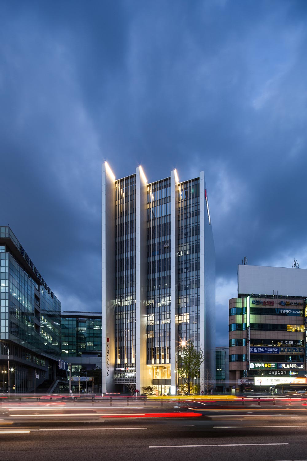 중심을 관통하는 주요 도로변에 위치한 대개의 건물들은 서로 어깨를 나란히 하면서 하늘로 수직의 높이 경쟁을 하는 것이 기본이다. 대구의 주간선도로인 달구벌대로 역시 도심구간에서 그 추세가 나타나고 있다. 도로변은 도시의 경관 그리고 공공의 보행과 휴식을 위해 의도적으로 건축물이 앞으로 나올 수 있는 최대의 한계선을 정해 놓고 있다. 그렇게 건물들은 일견 서로 사이좋게 질서를 유지하면서 어깨동무를 한다. 건축한계선과 건축지정선의 차이는 뚜렷하다. 전자는 공공의 배려를 위한 최소한의 선으로서 그 이상으로 나의 땅을 내어주는 것은 얼마든지 허용된다. 하지만 후자는 다른 이야기다. 공공에 대한 배려와 함께 도시의 경관적 질서를 구성하겠다는 강한 의지가 내포되어 있다. 병원이 들어설 땅은 전자에 속한다. 폭이 좁고 길이가 긴 크지 않은 땅. 더군다나 도로와 수직으로 만나지 않고 30° 기울어져 비스듬히 만나고 있는 땅에서 건물은 어떻게 자리를 잡아야 하는가? 작은 땅이지만 공공을 위한 배려와 도시의 경관적 질서를 동시에 고려할 수는 없는가? 땅과 이웃하고 있는 땅들 그리고 그 땅을 채우고 있는 건물들은 어떠한가? 병원의 기능을 고려한 공간의 효율성을 위한 평면의 형상은 땅의 모양과 어떻게 조우해야 할 것인가? 건물 의 디자인을 시작하면서부터 마지막까지 놓지 않고 있었던 물음들이다.