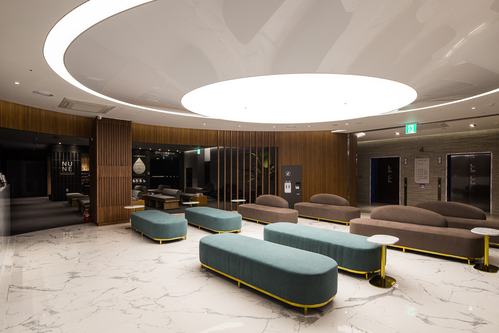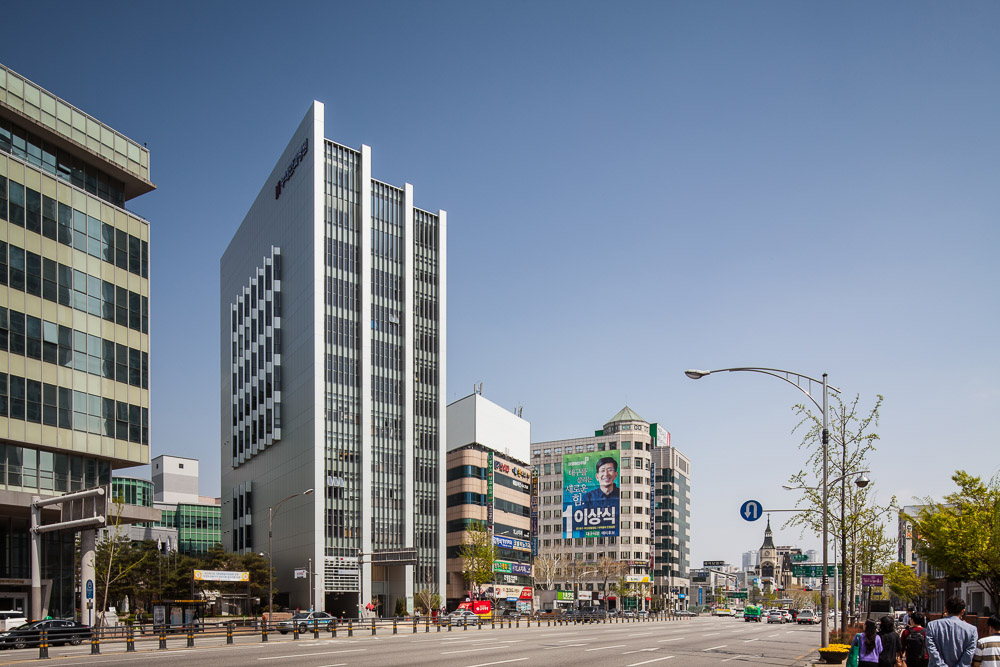The lightly shining anodizing finish of the building' s envelope vividly express the modernity of a city. In addition, the curtain wall window on the facade overlooking the road has also the attribute of light and fast digital rather than heaviness. The way of aligning three masses provides a sense of speed. The building, which is full of lightness, epidermal, digital and bit speed, is enough to show the materiality of a sophisticated modern city, but it breaks itself in the uppermost space. A wide-open courtyard and a garden on the top floor provides relaxation and depth with one step away from fast pace urban life.