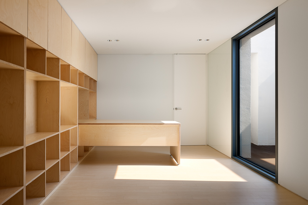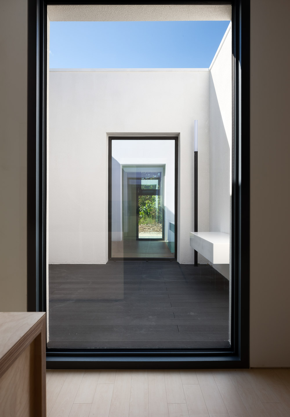 It is difficult to open a door or a window because a mountain house has risks of crimes or wild animals. In order to solve such a problem, we designed the courtyard at the center of the building. So, windows and doors facing the courtyard can always be opened. In addition, it is possible to ventilate and light in all spaces through this place. If all the windows and doors are opened only in the space surrounded by the courtyard, safety may be secured but it can be stuffy. To solve this problem, we put the large fixed window on the south side so that either courtyard or the outside scenery can be visually connected through the inside of house. In order to protect the privacy from the road, we did not make any windows on the roadside, and made a wall in front of the entrance door. The wall can be used not only for the purpose of blocking the sight, but also as a lighting device, a support for the canopy glass, and a small bench.