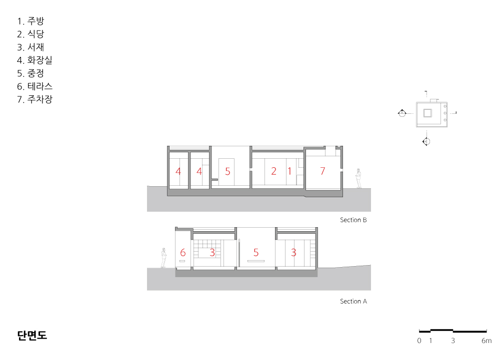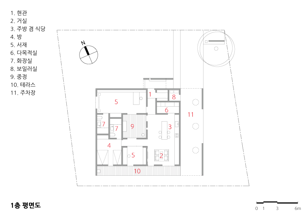 이 주택에 대한 사항을 간단하게 나열해 보면 다음과 같다. 산속의 집은 방범이나 산짐승 등의 침입이 우려되기 때문에, 문이나 창문을 열고 지내기 힘들다. 그런 문제를 해결하기 위해, 건물의 중앙에 중정을 설계했다. 이로 인하여 중정 쪽으로 만든 창문이나 문을 언제나 열어 놓을 수 있다. 또한, 이곳을 통해 모든 공간에 환기도 되고, 채광이 가능하다. 모든 창문이나 문이 중정 쪽으로 둘러싸인 공간으로만 열린다면 안전성은 확보될지는 몰라도 답답해질 수 있다. 이를 해결하기 위하여 큰 창이 있는 남측 창은 문 형식이 아닌 창문 형식으로 계획했다. 내부의 각각의 공간에서 중정을 통해 건너편의 공간뿐 아니라 건너편의 공간을 통해 밖의 모습을 보는 것도 가능하도록 했다.도로 측에서의 프라이버시 보호를 위하여 도로 측에는 창문을 일절 만들지 않았고, 출입문 앞에는 가벽을 만들어, 이 가벽은 단순히 시선을 차단하는 목적뿐 아니라 조명장치, 캐노피 유리의 지지, 작은 벤치로 활용된다.