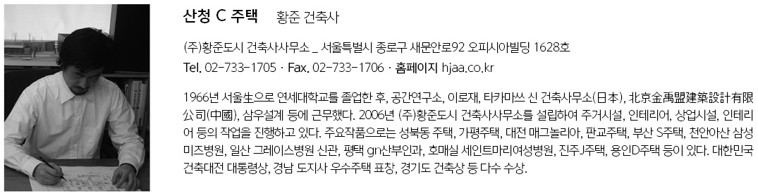 | 산청 C 주택 설계자 | 황준 _ (주)황준도시 건축사사무소 건축주 | 김성은 감리자 | 황준 _ (주)황준도시 건축사사무소 시공사 | 김성은 설계팀 | 남해룡, 서한나, 신보은 대지위치 | 경상남도 산청군 단성면 방목리 주요용도 | 단독주택 대지면적 | 560.00㎡ 건축면적 | 186.00㎡ 연면적 | 186.00㎡ 건폐율 | 33% 용적률 | 33% 규모 | 지상 1층 구조 | 철근콘크리트조 외부마감재 | 인조목재, SKK 세라타이트 코팅 내부마감재 | 자작나무합판, 목재바닥판, 친환경페인트 설계기간 | 2017. 09 ~ 2018. 11 공사기간 | 2018. 04 ~ 2018. 11 사진 | 박영채 구조분야 : 이우호 _ 티섹구조 기계설비분야 : (주)천일이앤씨 전기분야 : (주)천일이앤씨 |