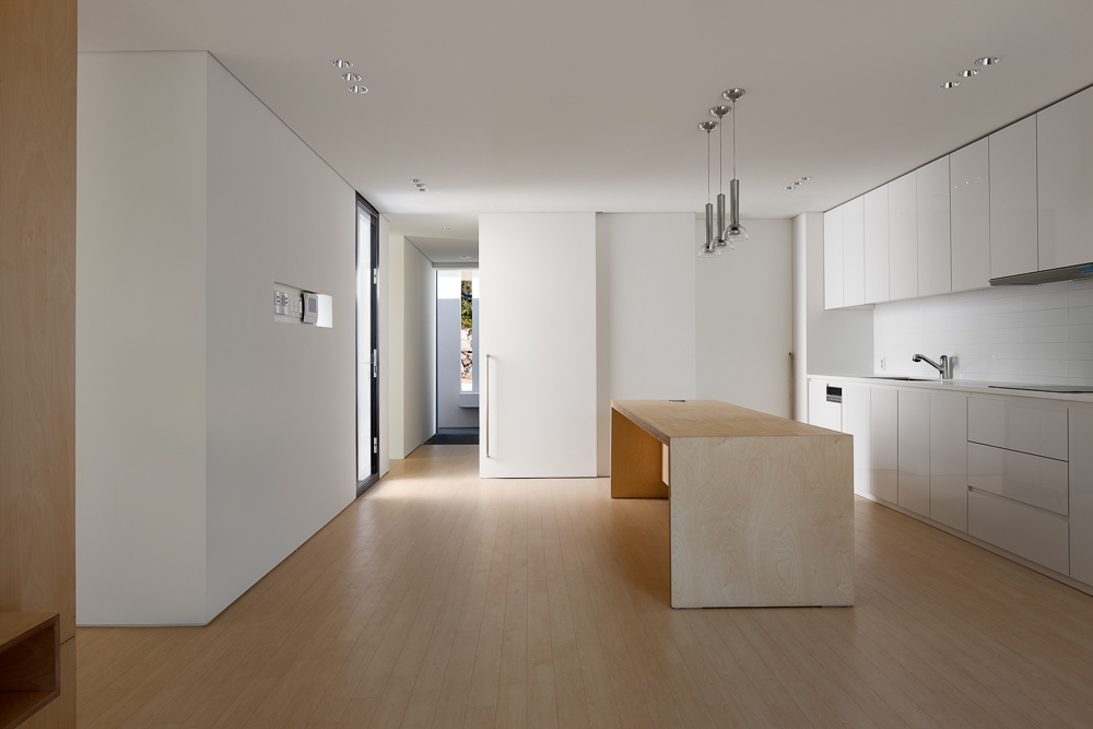 Living room, dining room, and kitchen space were made into one large space for multipurpose use. The finish was designed with birch plywood, ivory eco-friendly paint, and iron plate. The furniture was made using the interior finishing materials. The biggest problem in mountain houses and remote houses away from a city is maintenance. Since it is an area without city gas connected, it should use an oil boiler or gas boiler which may be dangerous. So, we proposed to install a new type of heating and cooling system to minimize the maintenance. Centralized air purification ventilation heat exchange system was installed. Even when the clients travel abroad, they can check the overall situation of the house and also can talk with visitors through video interphone system.
