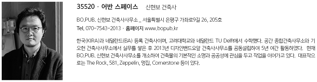 | 어반 스페이스 설계자 | 신현보 신현보 건축사사무소 건축주 | 김재성, 박기란 감리자 | 김영훈 시공사 | 라우종합건설 설계팀 | 이수지 대지위치 | 서울특별시 마포구 와우산로5길 23 주요용도 | 근린생활시설(휴게음식점, 사무소) 대지면적 | 195.47㎡ 건축면적 | 109.46㎡ 연면적 | 388.14㎡ 건폐율 | 56.00% 용적률 | 198.57% 규모 | 지상 5층 구조 | 철근콘크리트조 외부마감재 | 시멘트타일, 박판세라믹타일(펄도장), 투명로이복층유리, 저반사로이복층유리 내부마감재 | 시멘트벽돌, 수성페인트, 세라믹타일 설계기간 | 2017. 08 ~ 2018. 03 공사기간 | 2018. 03 ~ 2019. 01 사진 | 노경 구조분야 : 이든구조컨설턴트 기계설비분야 : 정연엔지니어링 전기분야 : 정연엔지니어링 소방분야 : 정연엔지니어링 |