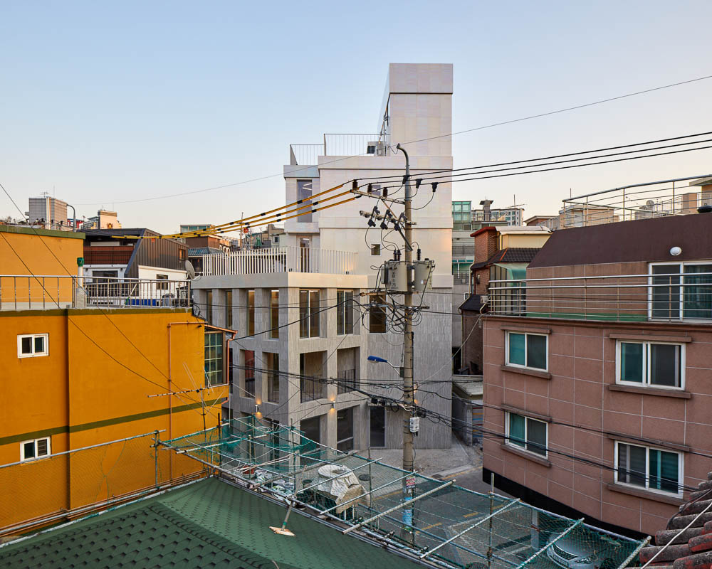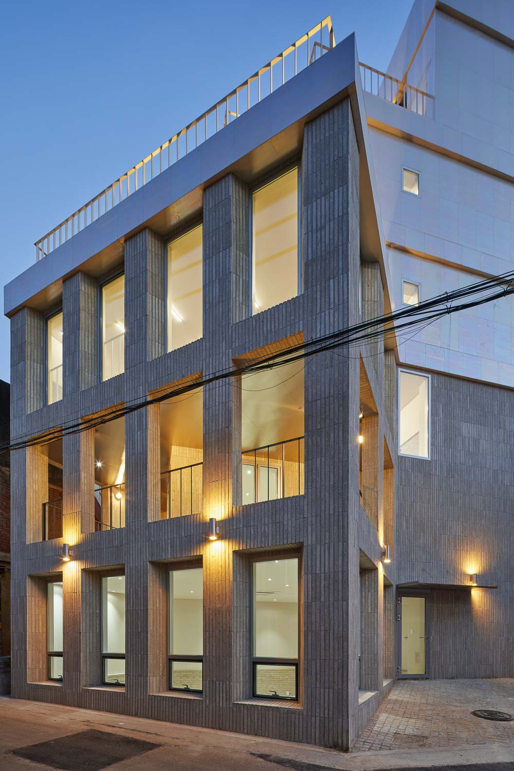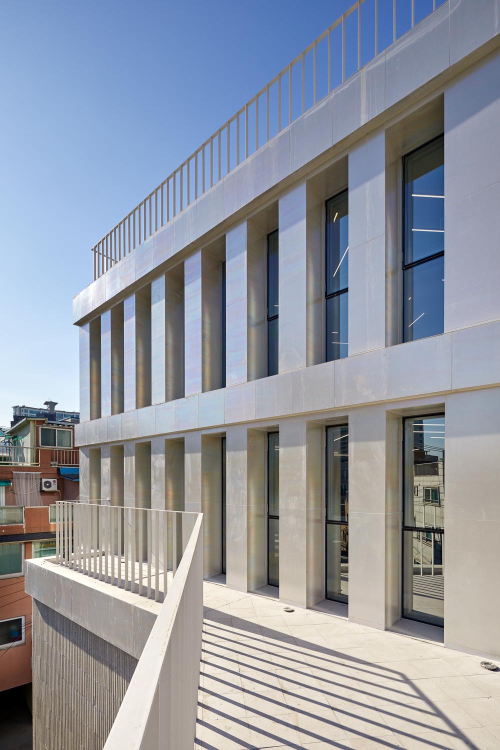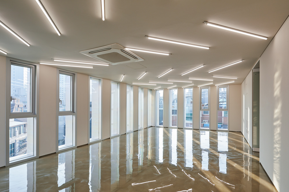 Each floor has its own exterior balcony by the setback. The form which is required by the city regulation created better outdoor environments for leasing spaces with the rent increased. And the setbacks were carefully designed to conform the local ordinance regarding to the limited number of building balconies in Mapo-gu (In Mapo, it restricts the form of terraced buildings to prevent illegal buildings extension)', and the two masses of the lower and upper parts were largely twisted together to complete the shape.
