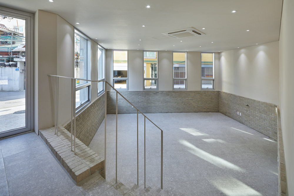 Each floor has its own exterior balcony by the setback. The form which is required by the city regulation created better outdoor environments for leasing spaces with the rent increased. And the setbacks were carefully designed to conform the local ordinance regarding to the limited number of building balconies in Mapo-gu (In Mapo, it restricts the form of terraced buildings to prevent illegal buildings extension)', and the two masses of the lower and upper parts were largely twisted together to complete the shape.