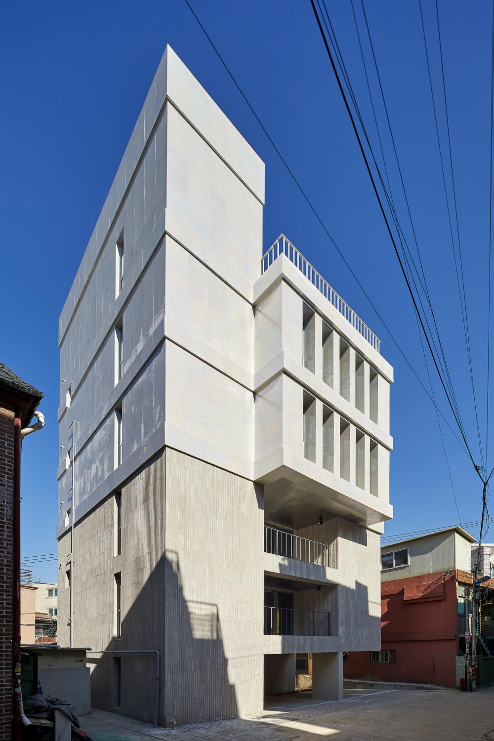 마포구 상수동에 위치한 임대용 근린생활시설이다. 상수역 사거리에서 한강 방향 블록 안쪽 골목에 위치한다. 200제곱미터가 채 안 되는 작은 땅이지만 남쪽으로 3미터 도로가 닿고, 북쪽으로는 두 개의 4미터 도로가 코너에서 만나고 있다. 더군다나 앞쪽 도로는 몇 년째 확장 중인 상수동 상업거리의 연장선상에서 상업적 가능성을 던져주고 있다. 늘 그렇듯 임대용 건물에 대한 건축주의 요구 사항은 명확했다. ‘가장 효율적으로 최대한의 임대면적을 확보’하기 위해서는 일조사선 제한을 피해 북측 전면도로 쪽에 주차장을 확보하고 건물은 남쪽방향으로 물러나 자리 잡아야 했다.
