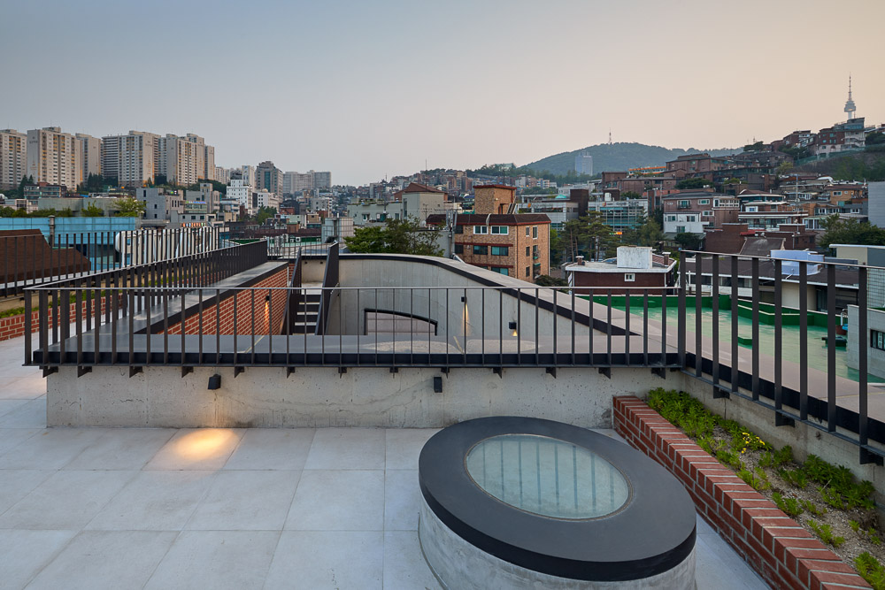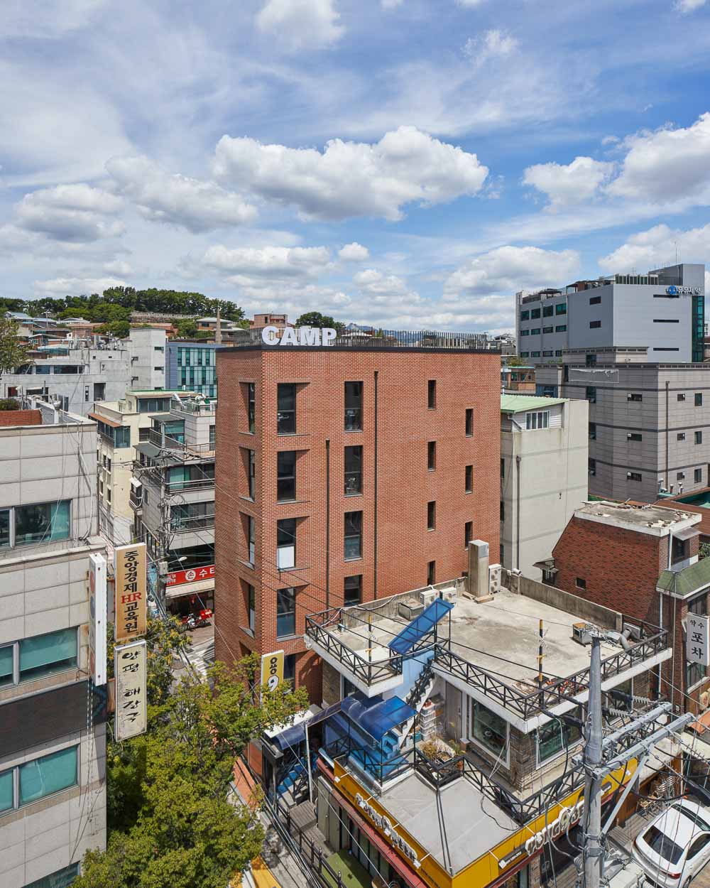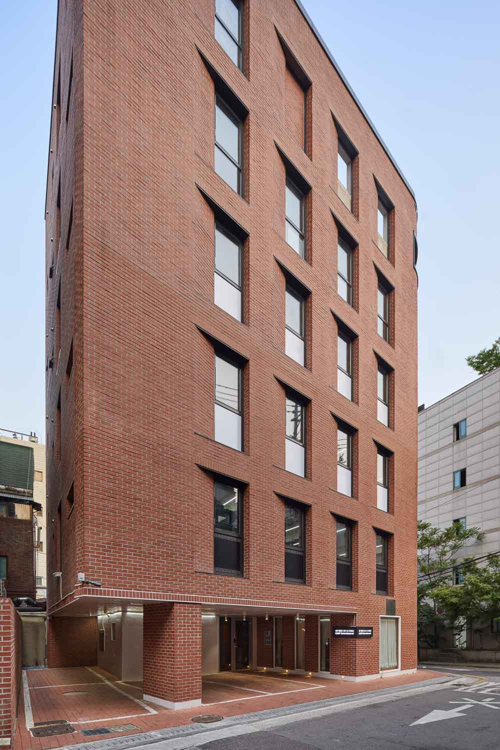 As it is a narrow lot within a semi-residential area, the building can be vertically straightened up. Even utilizing floor area ratio incentive in the district unit plan, we were able to find a long vertical shape which can be used to create an impressive corner design for the block. From the beginning of the project, a brick was chosen as the main material to reflect the atmosphere of the surrounding buildings as if it has been around for a long time. The corner part emphasized the solid feeling of bricks and made them look like huge brick pillars.