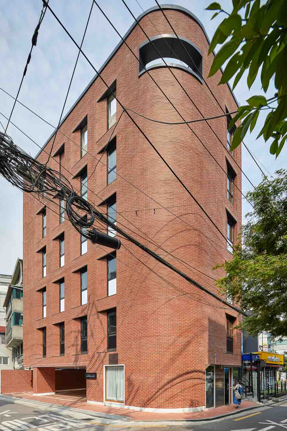 좁은 땅이지만 준주거지역이라서 건물이 수 직으로 곧게 올라갈 수 있는 데다가, 지구단 위계획 상의 용적률 인센티브도 있어서 수직으로 긴 형상을 찾아낼 수 있었다. 이를 이용하여 인상적인 코너부 디자인을 도출해내고 싶었다. 계획 초반부터 주변 건물들의 분위기를 반영하여 전체적으로 그 동네에 오래 있었던 듯한 느낌을 주는 벽돌을 주재료로 선정하였었는데, 코너 부분은 벽돌의 단단한 느낌을 더 강조해 거대한 벽돌 기둥처럼 보이도록 유도했다.