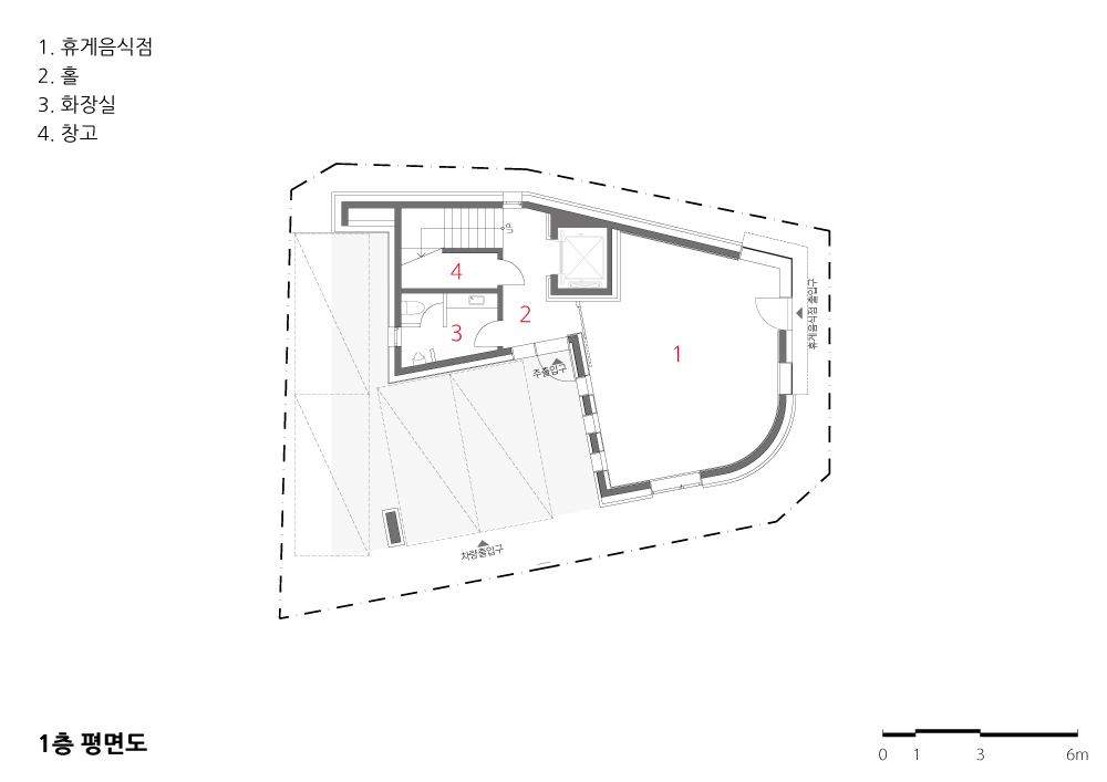 약수역 사거리 뒤편, 신당동 안쪽 골목 코너에 위치한 대지다. 관찰 결과 이면도로지만 직장인 유동인구가 상당하다는 것을 알 수 있었다. 건축주와 논의하여 1층은 카페, 상층부는 사무소로의 임대 목표를 빠르게 설정하고 작업에 들어갔다.