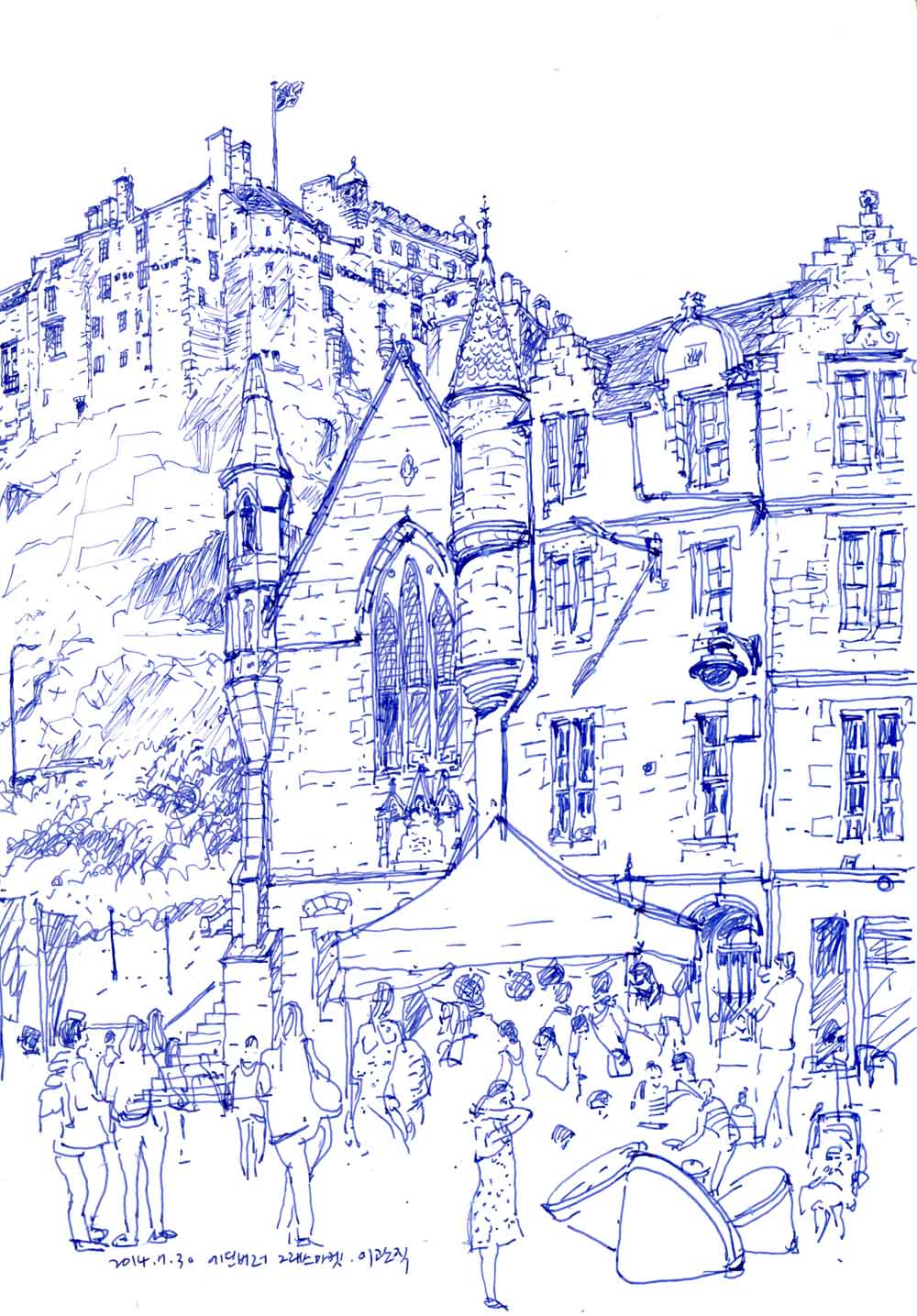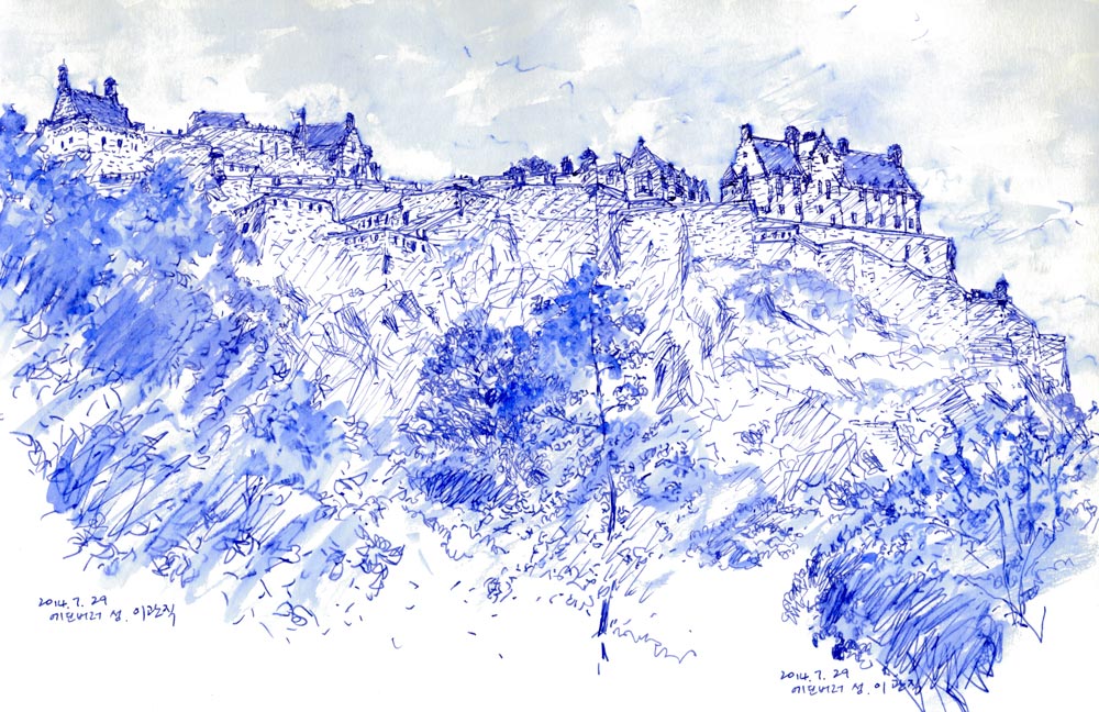 애든버러성을 올려다 본다. 중세의 건축물들을 가지고 있는 스코틀랜드의 오래된 도시이다. 런던에서 기차를 타고 북쪽으로 올라오면서 창밖의 풍경은 문명 시대와 기후 자연이 교차되는 연대기를 보여준다. 현대 도시의 빌딩군을 빠져나오고 나면 왼쪽으로는 구릉지가 펼쳐지고 푸른 숲과 초원이 반복된다. 한참을 지나면 넓게 펼쳐진 바다가 나타난다. 붉은 벽돌에 경사진 지붕의 건물들이 모여 있는 바다 마을 풍경을 지난다. 애든버러 근처에서는 붉은 벽돌의 건물보다 짙은 색의 돌들을 쌓아 만든 견고한 건물이 주를 이룬다. 스코틀랜드 도시의 건물들은 오랜 역사 속에 추 운 기후와 전쟁의 기운이 스며있다. 전쟁의 역사를 간직한 중세 성의 도시는 이제 축제의 도시가 되었다. 애든버러의 여름은 세계에서 가장 큰 애든버러 프린지 예술공연 축제가 열린다. 여전히 의연한 절벽 위 고성과 검고 두터운 돌로된 건물 들은 바쁜 여행객을 마법의 전설과 겨울나라 동화의 동심으로 이끈다.