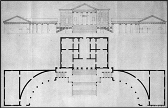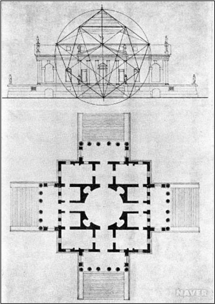 르네상스를 꽃피웠던 시기(1420-1580년)에는 고전 건축과의 연결점을 지속적으로 탐구했는데, 브루넬레스키는 르네상스 건축의 길을 열어 놓은 건축사로서 로마시대의 유적을 끊임없이 답사 탐구하고 고전건축의 모델을 원리로 적용시켰다. 팔라디오(Andrea Palladio, 1508-1580)는 이 시대의 건축사로 1508년 파도바에서 출생했고 16세부터 비첸차(Vicenza)로 이주한 후 그곳에서 대부분을 보냈다. 르네상스 건축사로써 순환성과 균형성을 갖고 있는 <원과 사각형>의 건축에 몰두했다. 팔라디오의 중심형 건축-도판35참조-을 통하여 중심 공간미를 갖는 원형과 사각형의 건축미를 살펴보고자 한다.