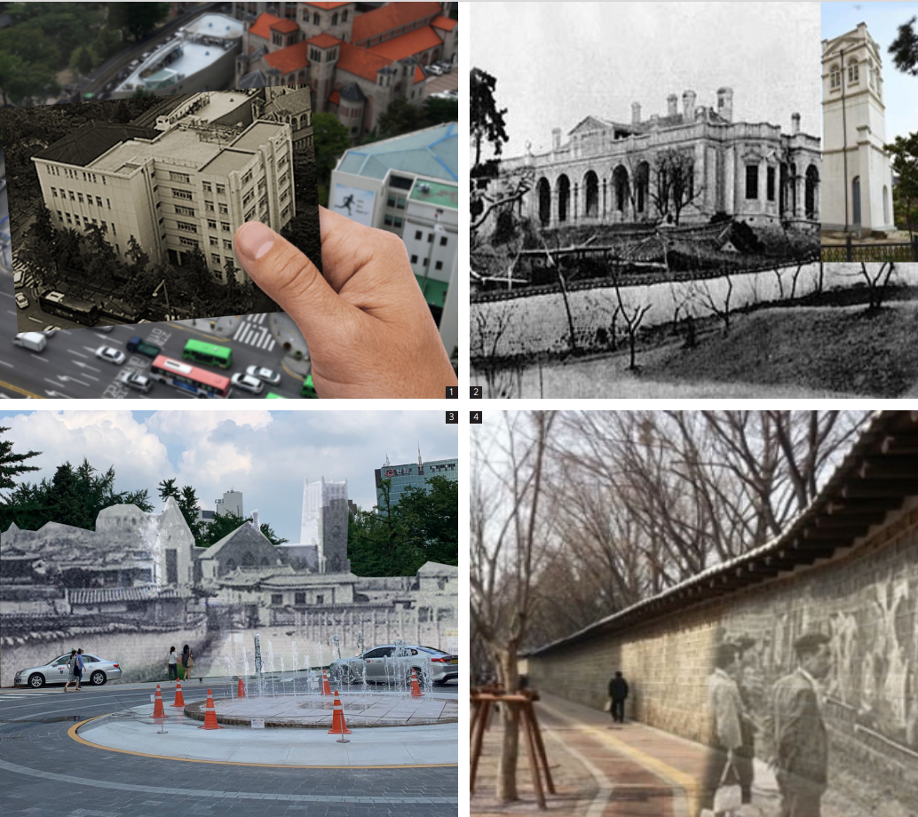➊ 일제의 잔재인 국세청 별관이 있던 자리, 성공회성당을 가리고 있던 모습. 지금은 도시건축박물관이 들어서 있다. (사진출처ㅣ뉴시스, 오마이뉴스) ➋ 1896년 촬영된 구 러시아 공사관의 모습, 현재는 사진의 칼라부분만이 남아 정동공원에 현존하고 있다. (사진출처ㅣ문화재청, 프랑스 프랑뎅공사 후손 칼메트 소장, 연합뉴스) ➌ 현재 정동길 중심에 있는 광장에서 보이는 과거 정동교회의 모습 (사진출처ㅣ핀터레스트 Sung-Jin Yoon) ➍ 1960년 미술가 협회전이 열렸던 과거의 돌담길과 현재의 돌담길의 모습. 신문화예술의 선구자인 김환기, 박수근 등의 예술가의 흔적이 있었던 곳이다. (사진 출처ㅣ최열 한국근현대미술사학회장, 윤명로 서울대 명예교수)