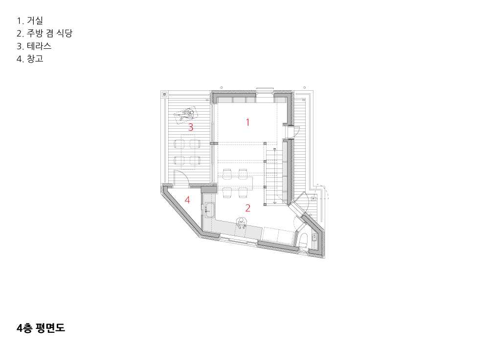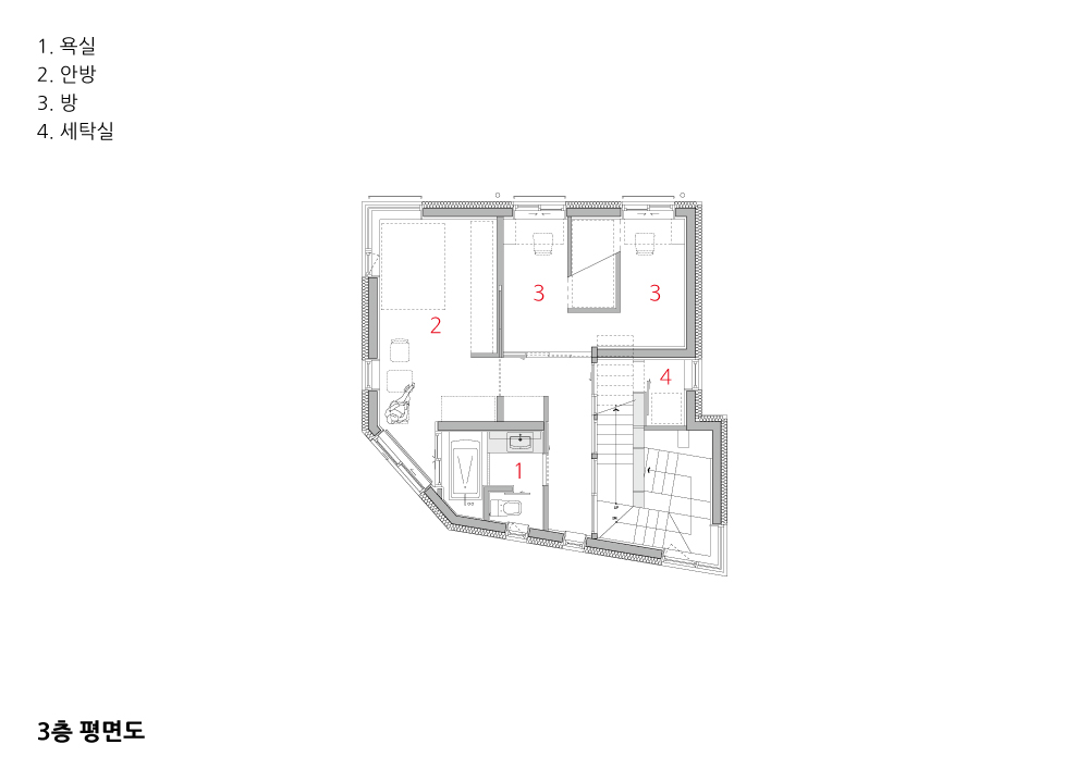 3, 4층은 두 아이와 건축주 부부의 단독주택으로 협소한 공간 활용을 위해 여러 가지 아이디어가 동원됐다. 3층에는 3개의 방과 욕실과 자투리 공간을 활용한 세탁실을 만들어 효율적으로 공간을 사용하였고 포켓도어와 연동도어를 활용해 공간을 확장시켰다. 격자무늬의 큰 창을 통해 오밀조밀한 골목풍경이 내려다보이는 욕실은 3층의 가장 멋진 공간이다. 4층에 남쪽을 향한 테라스 텃밭을 만들어 주방과 연결시키고 주방 상부에는 다락을 만들어 지붕층과 연결시켰다. 다락의 구조물은 해먹도 달고 운동기구도 걸리는 역할도 한다.